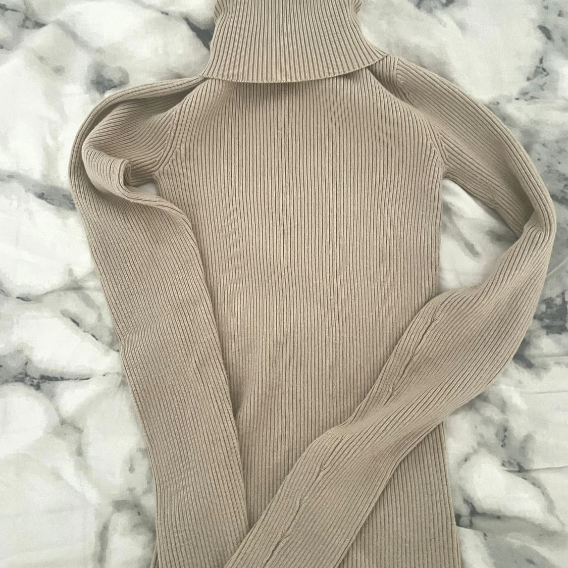 Säljer en supermysig beige polotröja i ribbat material. Perfekt för kyliga dagar med sin långa ärmar och höga krage. Tröjan är både stilren och bekväm, idealisk för höst och vinter. Passar perfekt till jeans eller kjol för en avslappnad look.