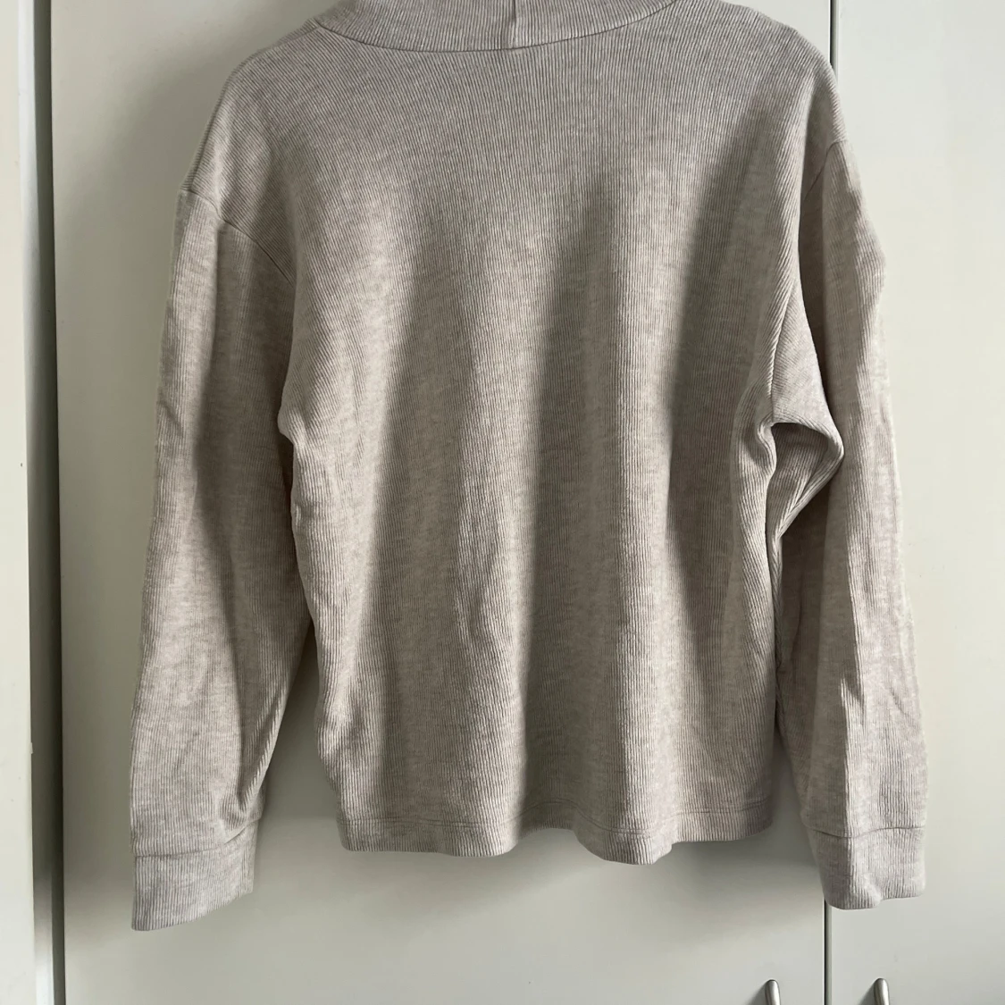 Säljer en stilren beige polotröja med ribbad struktur. Tröjan har långa ärmar och en bekväm passform, perfekt för kyligare dagar. Ett mångsidigt plagg som passar till det mesta i garderoben.