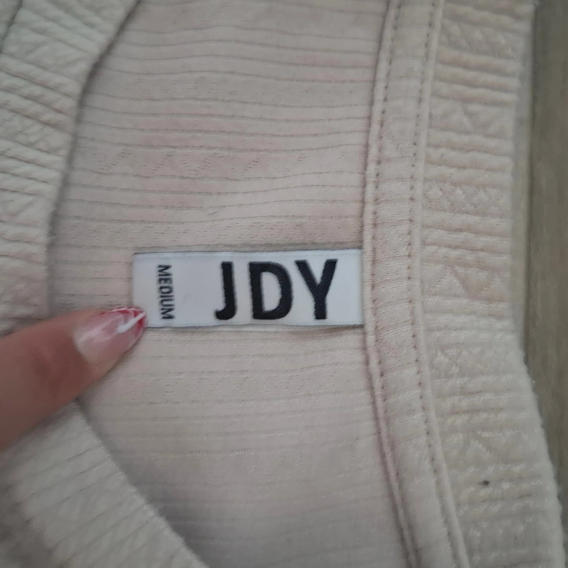 Säljer en beige ribbad tröja från JDY i storlek medium. Tröjan har långärmade puffärmar och bred mudd vid ärmslut och nederkant. Materialet är mjukt och har ett diskret mönster i strukturen som ger en snygg touch till looken.