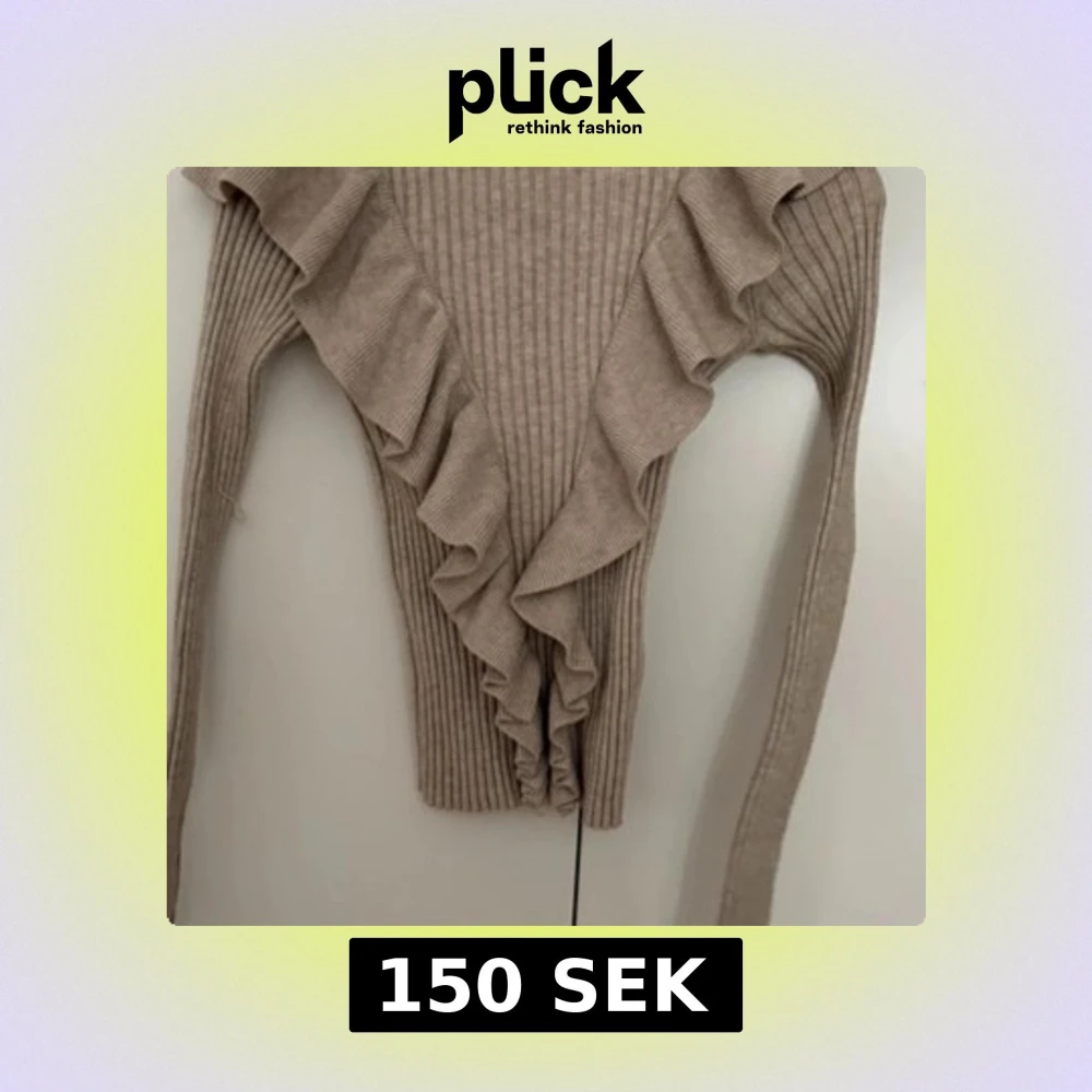 Säljer en beige ribbad tröja från Lindex med volangdetaljer längs framsidan.
