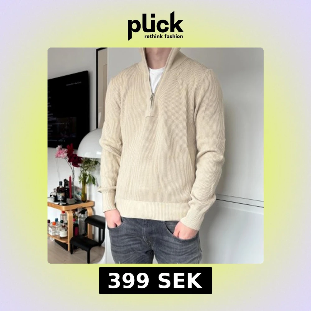 Snygg beige ribbad tröja med halv dragkedja och hög krage. Perfekt för en stilren och avslappnad look. Passar bra till jeans eller chinos.