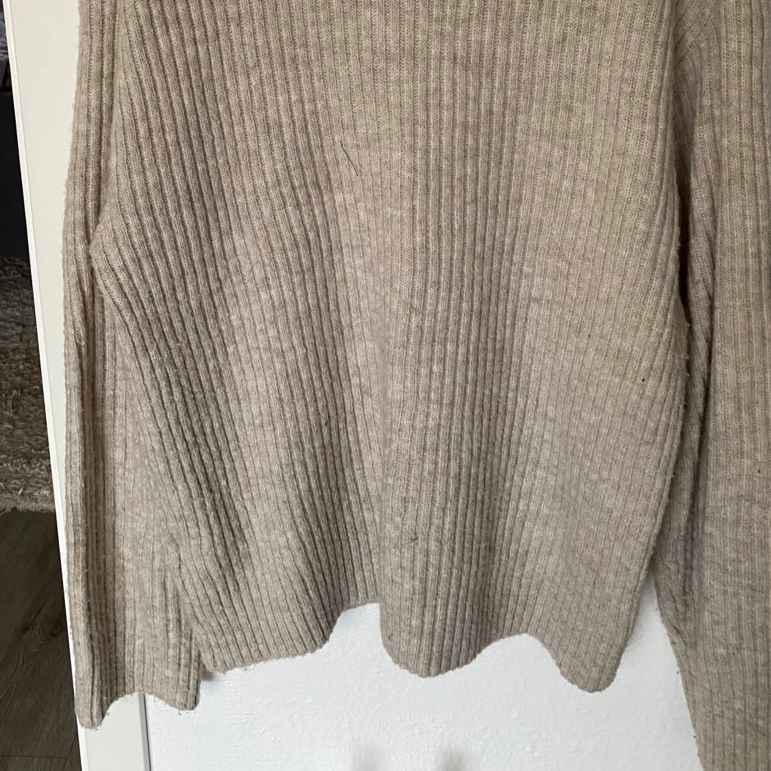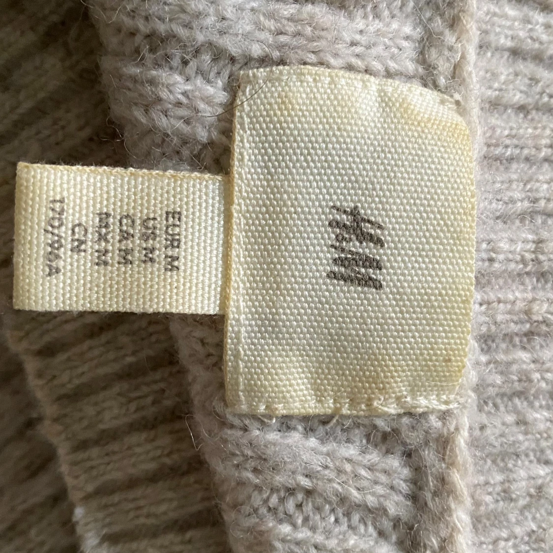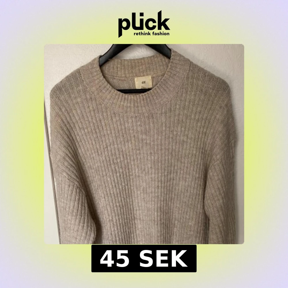 Mysig beige ribbstickad tröja från H&M i storlek M. Tröjan har en rund halsringning och långa ärmar, perfekt för lager på lager under kyliga dagar. Enkel och stilren design som funkar till det mesta.