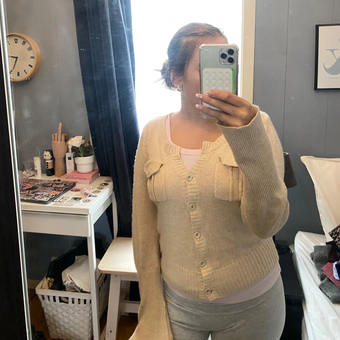 Säljer en mysig beige kofta med knappar framtill och ribbade detaljer. Koftan har långa ärmar och en rund halsringning. Perfekt för kyliga dagar! Merket ar Guess