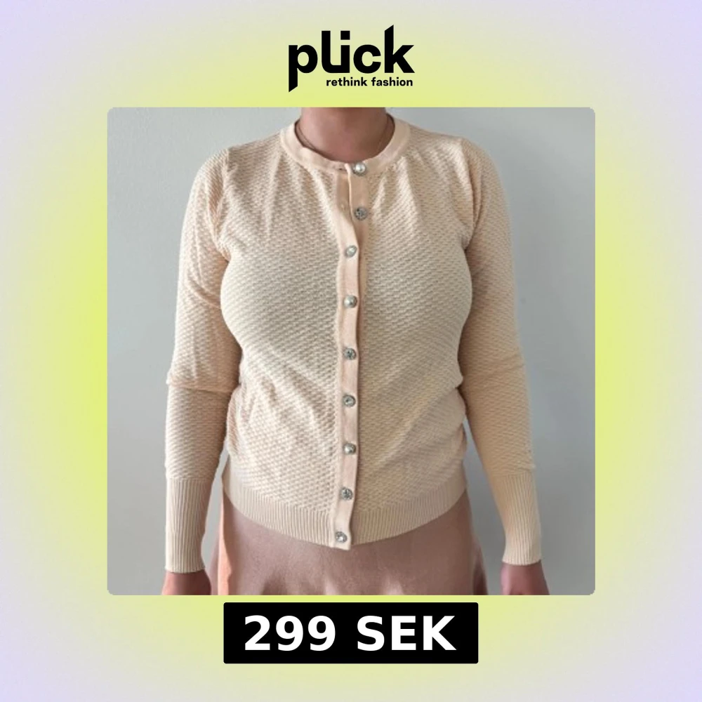 Snygg beige kofta med långärmad passform och glittriga pärlknappar framtill. Koftan har ett diskret strukturerat mönster och ribbade muddar vid ärmslut och nederkant. Perfekt för dig som gillar stilrena och mjuka plagg.
