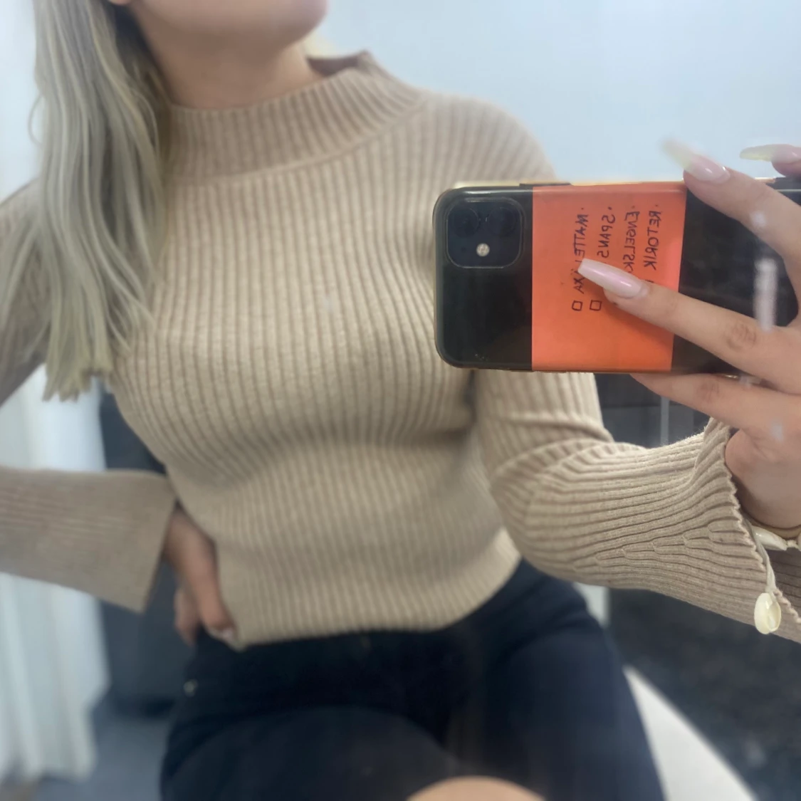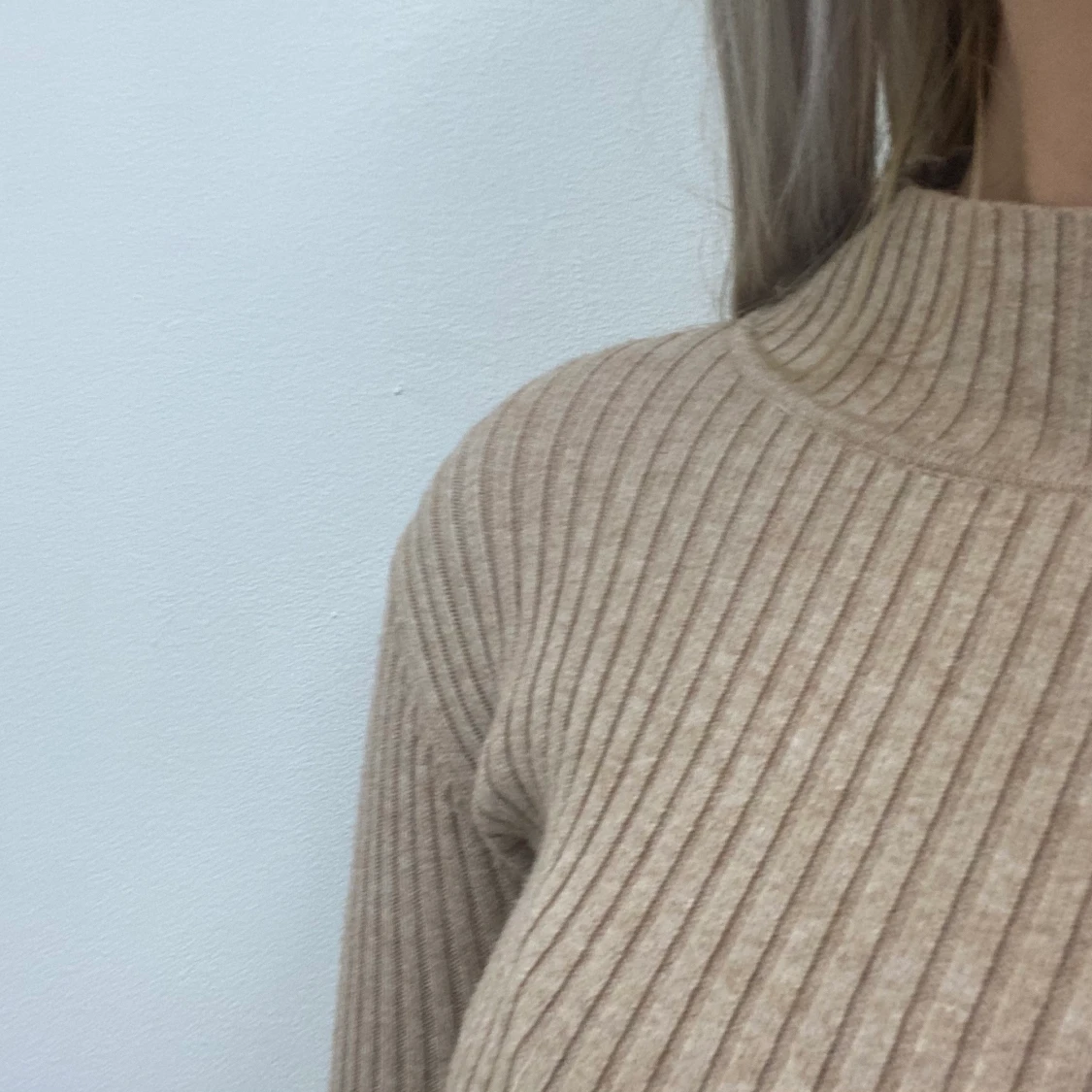 Tröjan är i tjockt material och väldigt stretchig. Den är halv polo och ärmarna är lite utsvängda. Den är varm och mjuk. Färgen är en lite mer rosa variant av beige och väldigt fin. Tröjan passar storlekarna XS-M, köpare står för frakt