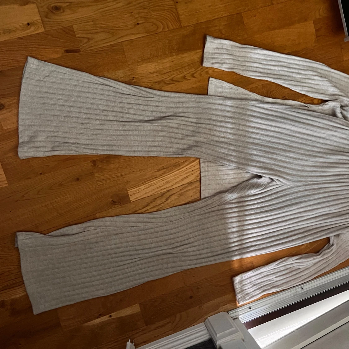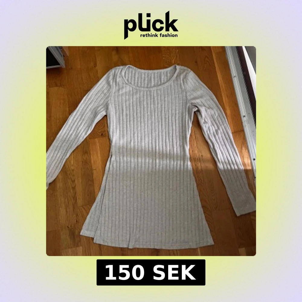 Säljer ett ljusbeige ribbad sett i mjukt material. Tröjan har rund halsringning och en figurnära passform som följer kroppen. Perfekt för dig som gillar enkel och stilren design.