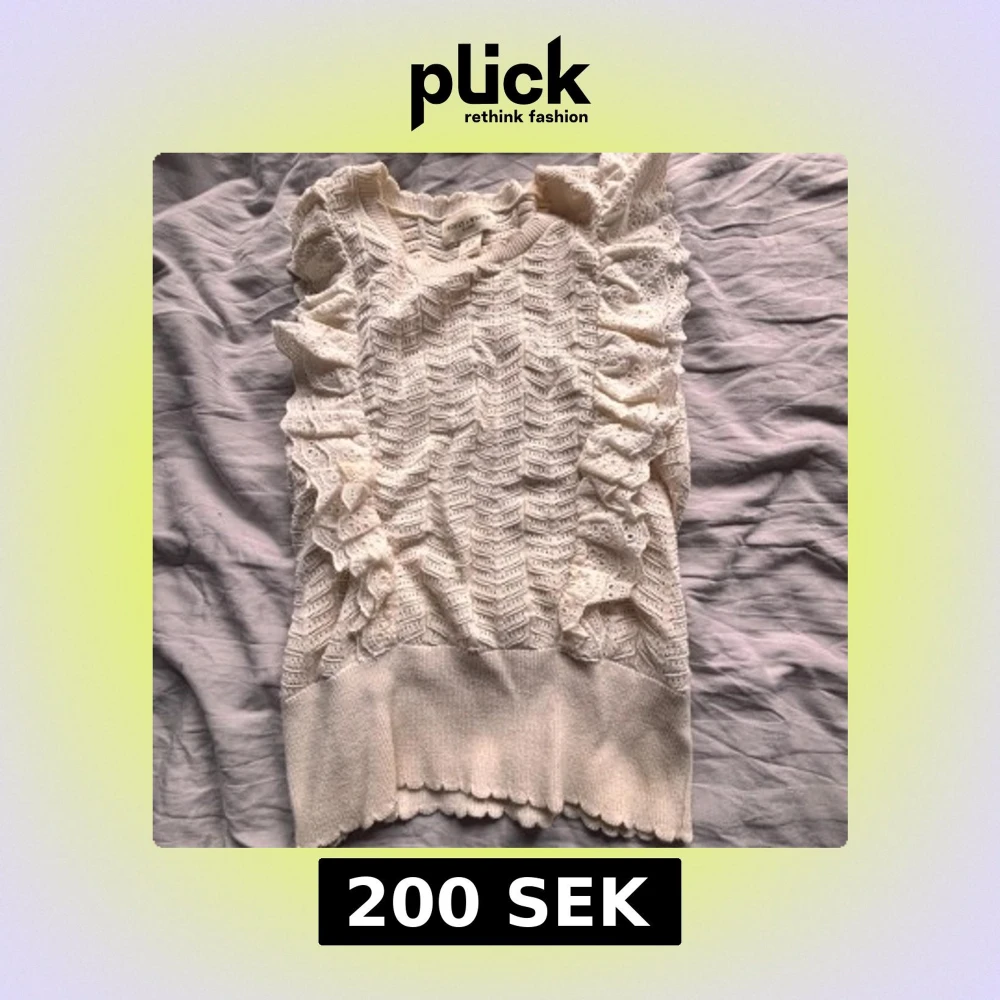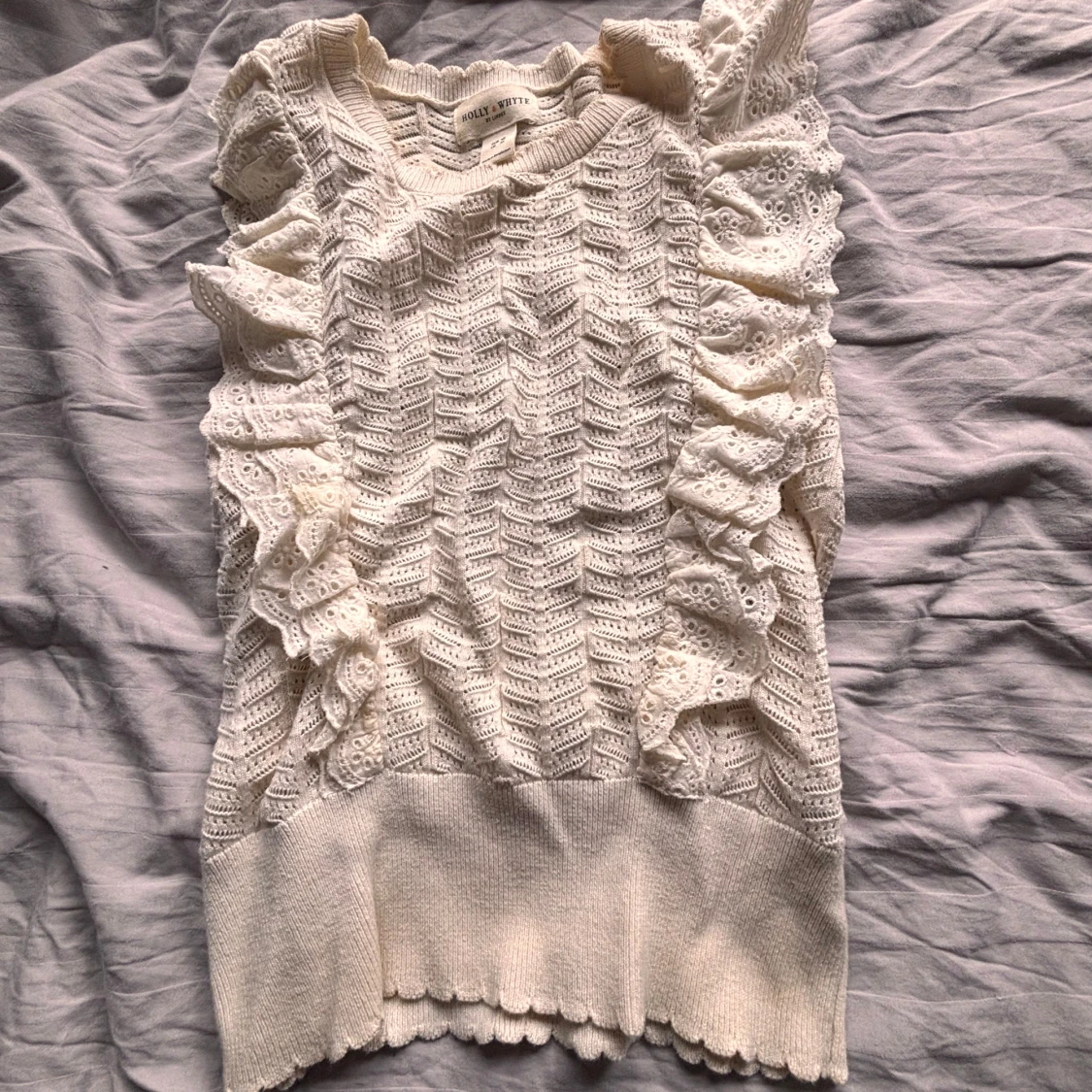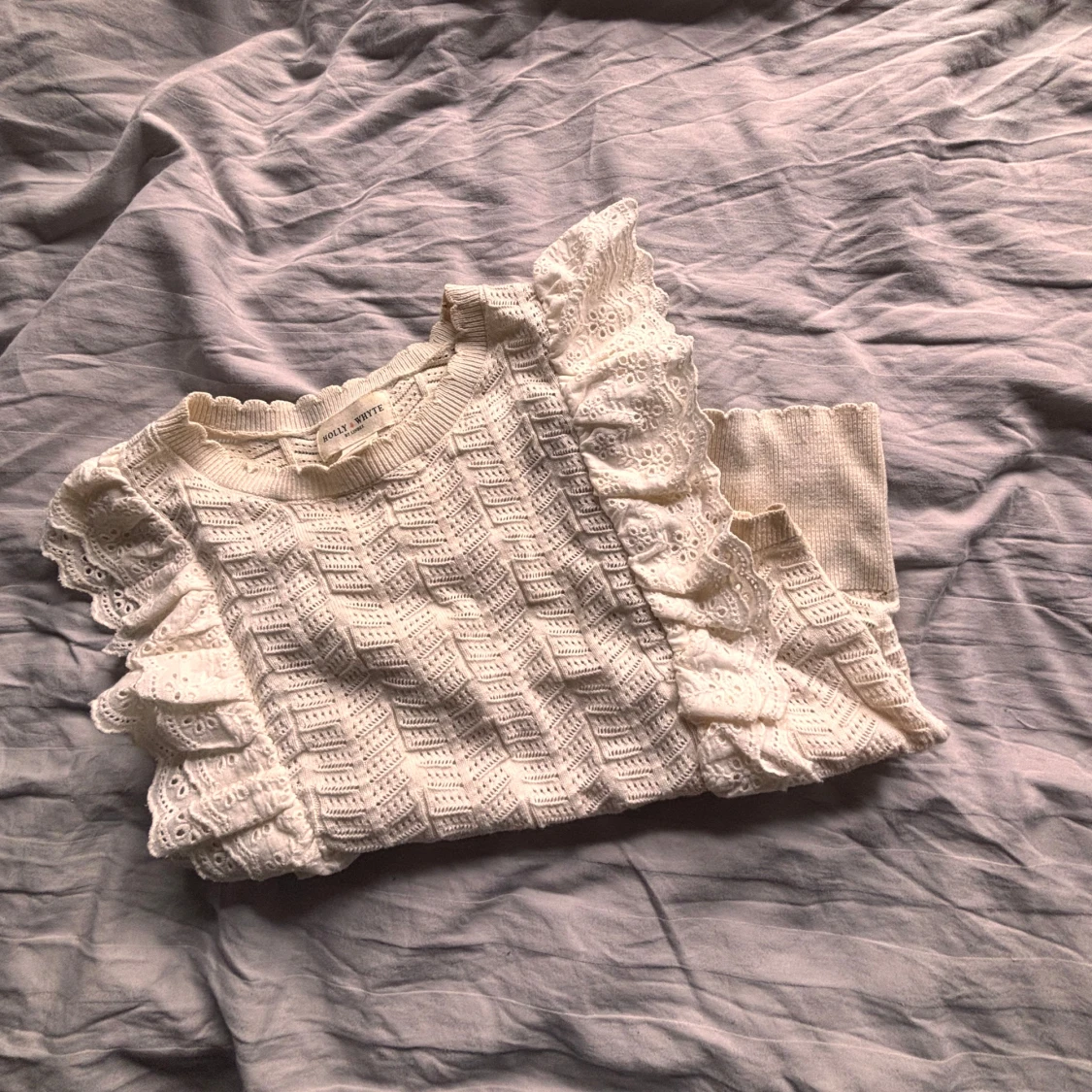 Säljer en söt beige topp från Lindex med spetsdetaljer och volanger längs sidorna. Toppen har en ribbad nederkant och ett vackert mönster som ger en romantisk känsla. Perfekt för att piffa upp garderoben!