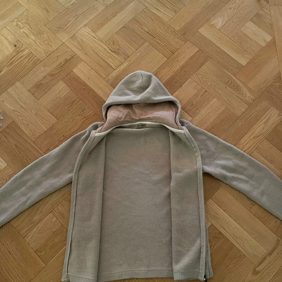Säljer en beige stickad cardigan från Reserved med dragkedja framtill. Tröjan har en mjuk huva med beige innerfoder och långa ärmar. Perfekt för lager-på-lager och chill dagar.
