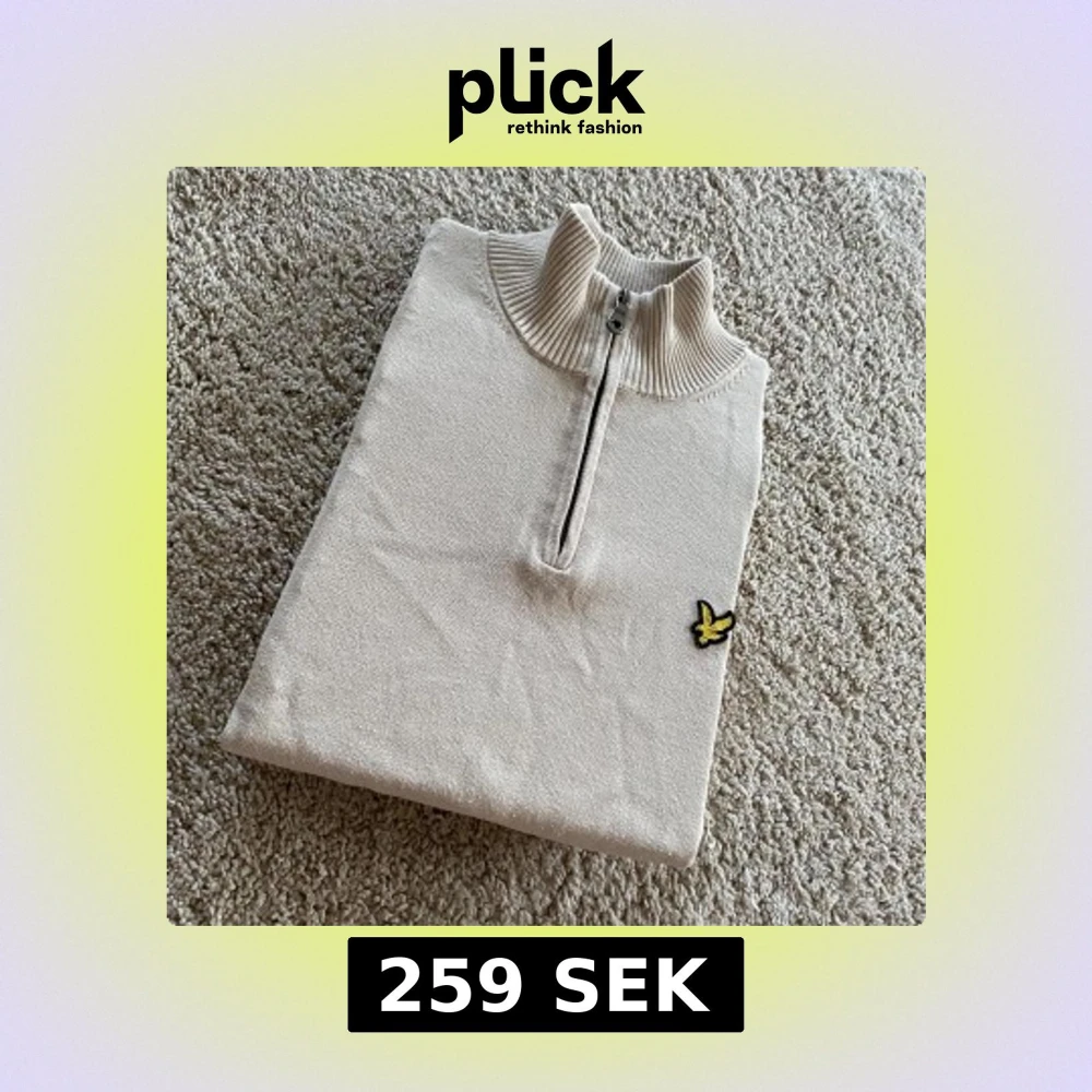 Snygg beige stickad tröja från Lyle & Scott med halv dragkedja och ribbad krage. Tröjan har det klassiska gula fågel-loggan broderad på bröstet. Perfekt för lager-på-lager och stilrena outfits.