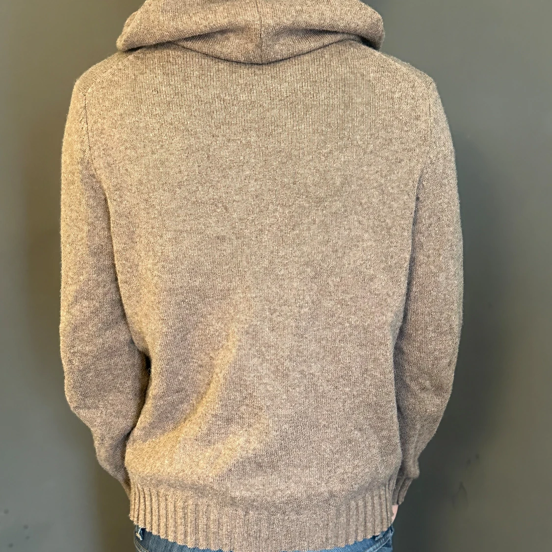Mysig beige stickad hoodie med huva och dragsko. Tröjan har lång ärm och ribbade muddar vid ärmslut och nederkant. Perfekt för kyliga dagar och enkel att matcha med jeans eller andra byxor.