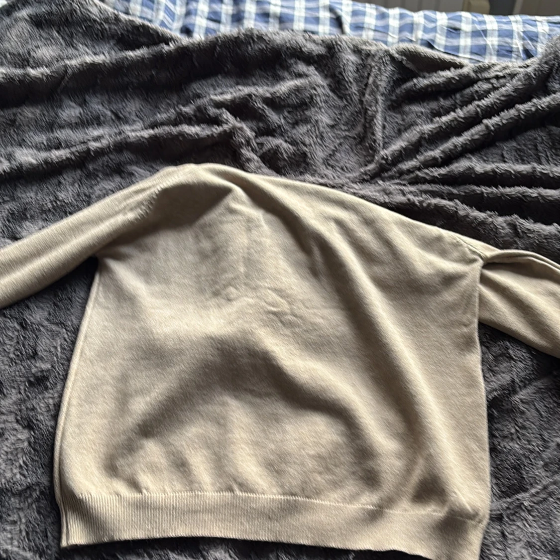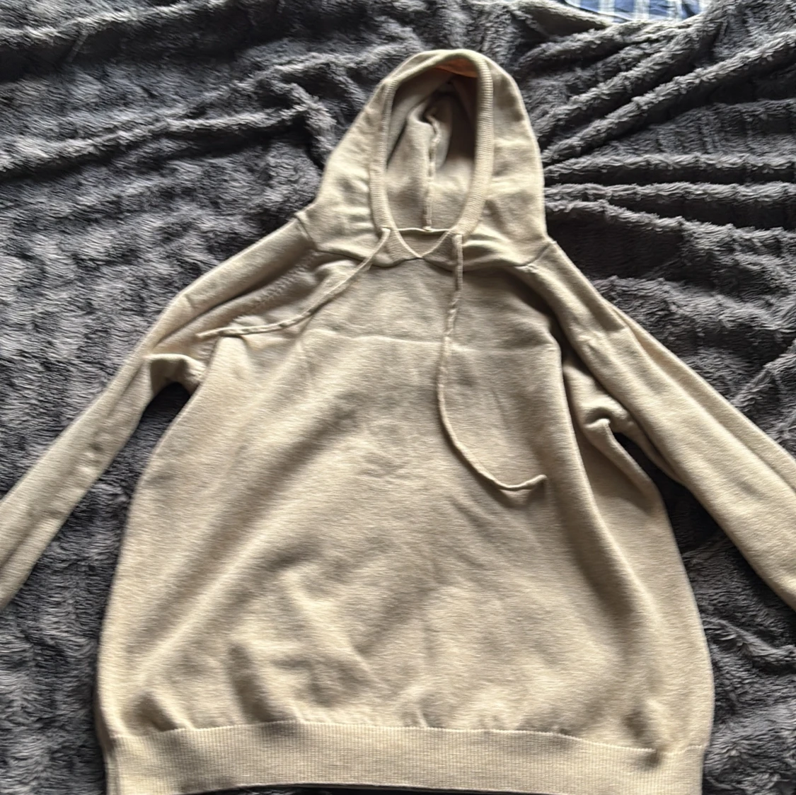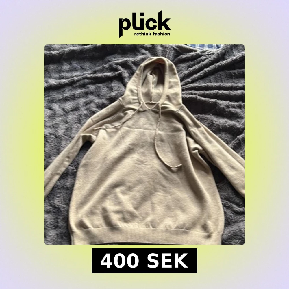 Säljer en beige stickad hoodie med långa ärmar och snörning i huvan. Tröjan har en enkel och clean look med ribbade muddar vid ärmslut och nederkant. Perfekt för dig som gillar en chill och stilren vibe.