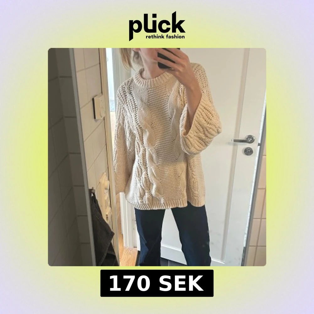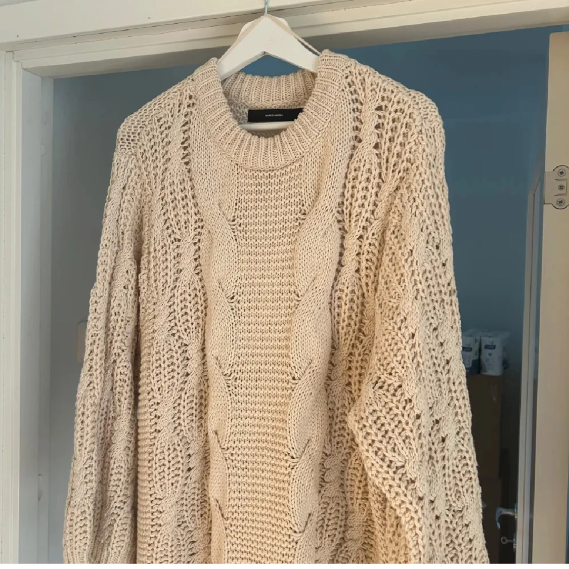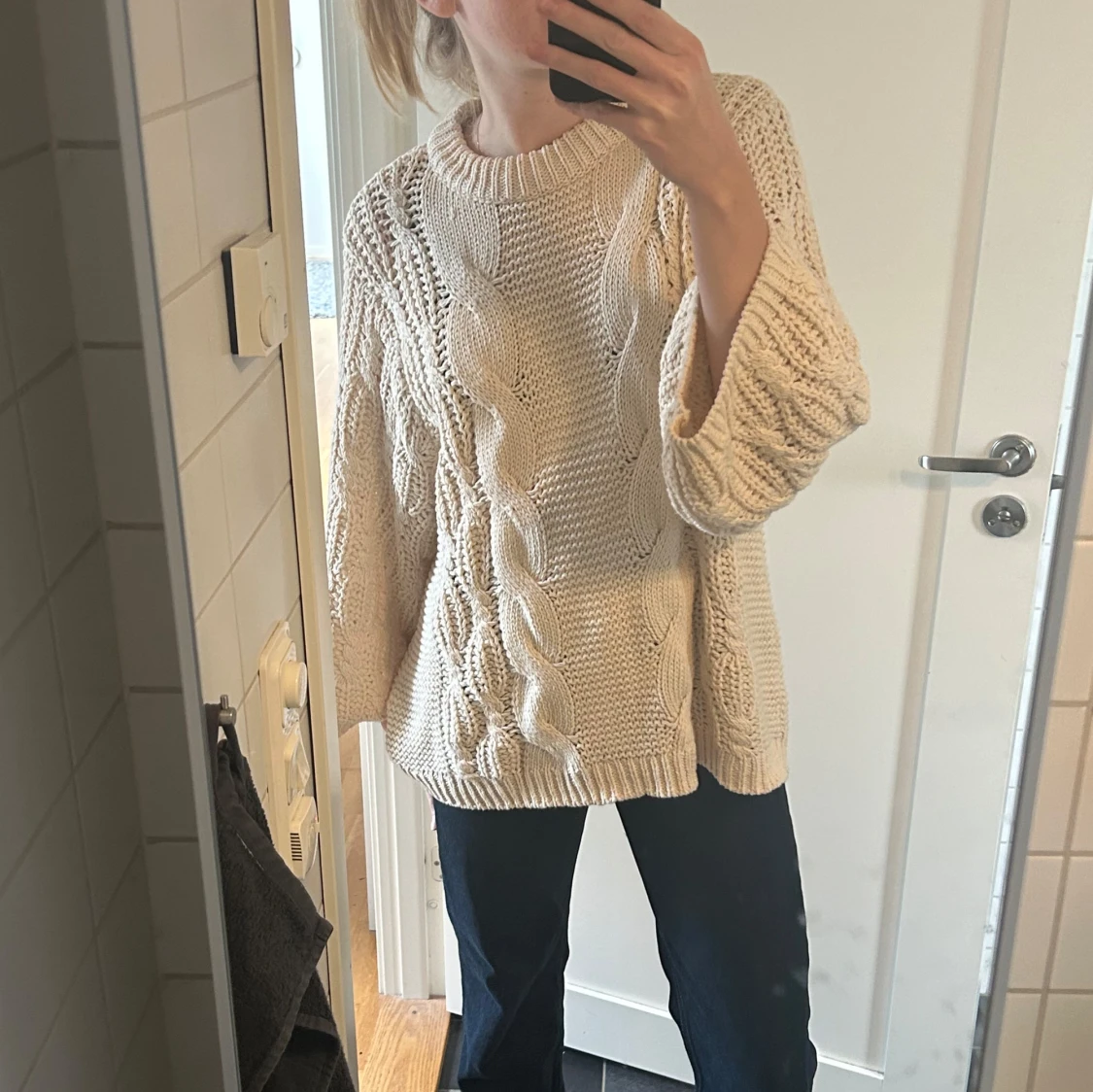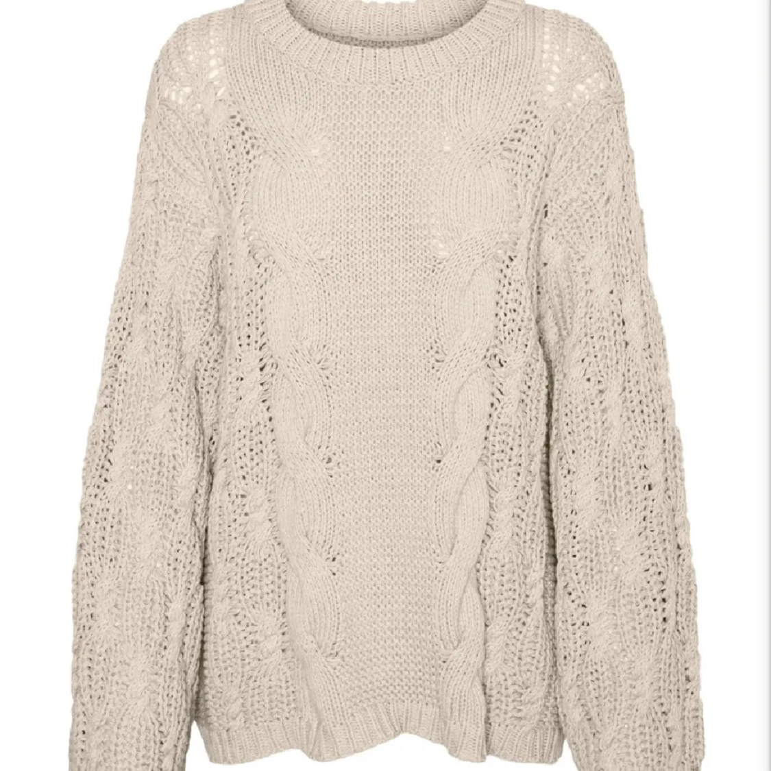 Säljer en chunky beige stickad tröja från VeroModa med grovt kabelstickat mönster och breda ärmar. Perfekt för lager-på-lager och riktigt mysig till sommarkvällar. Rund halsringning och avslappnad passform.