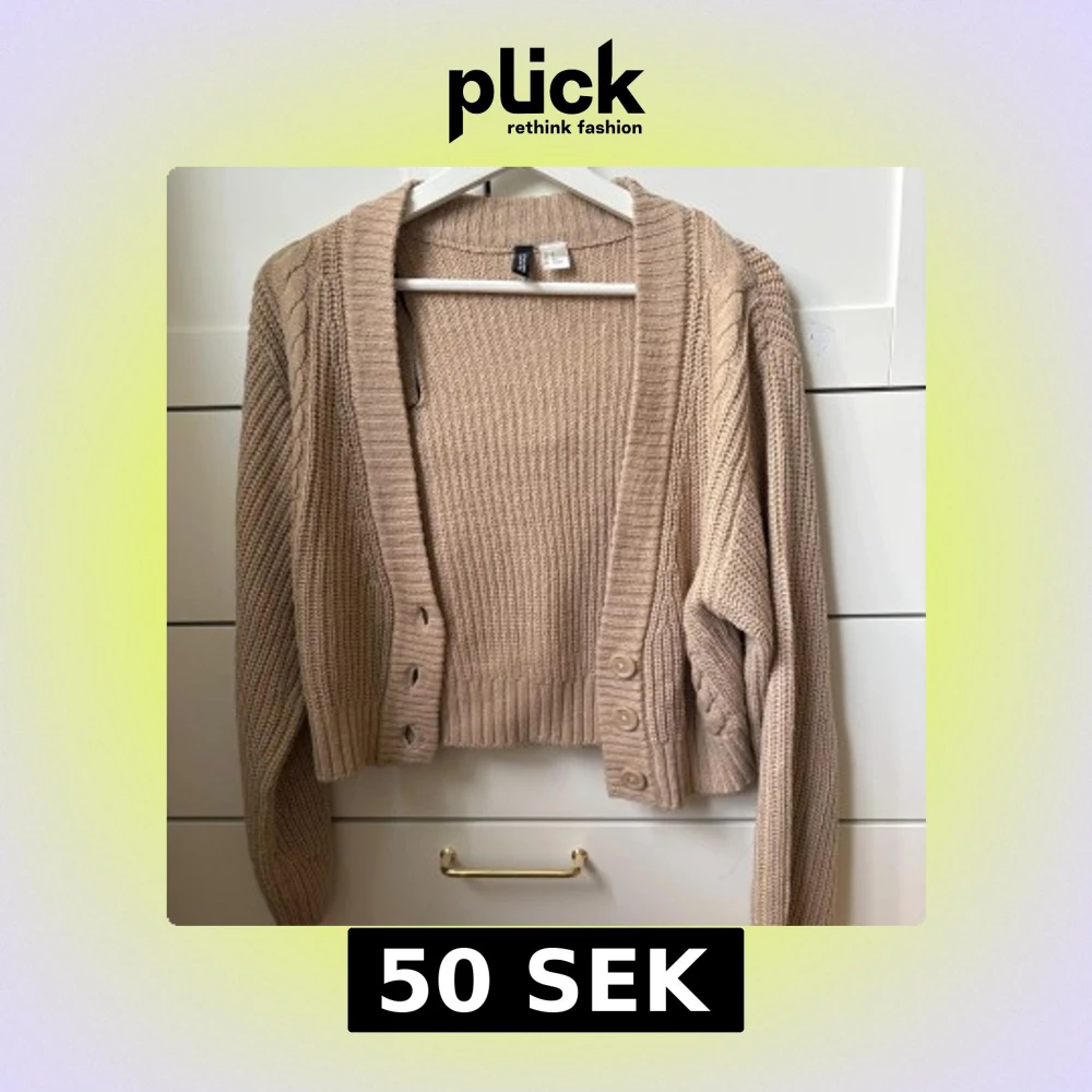 Supermysig beige/ljusbrun stickad kofta från H&M i croppad modell. Koftan har ribbade muddar, kabelstickade detaljer längs ärmarna och tre knappar framtill. Perfekt att slänga över en topp för en chill look. Långärmad och i mjukt material.