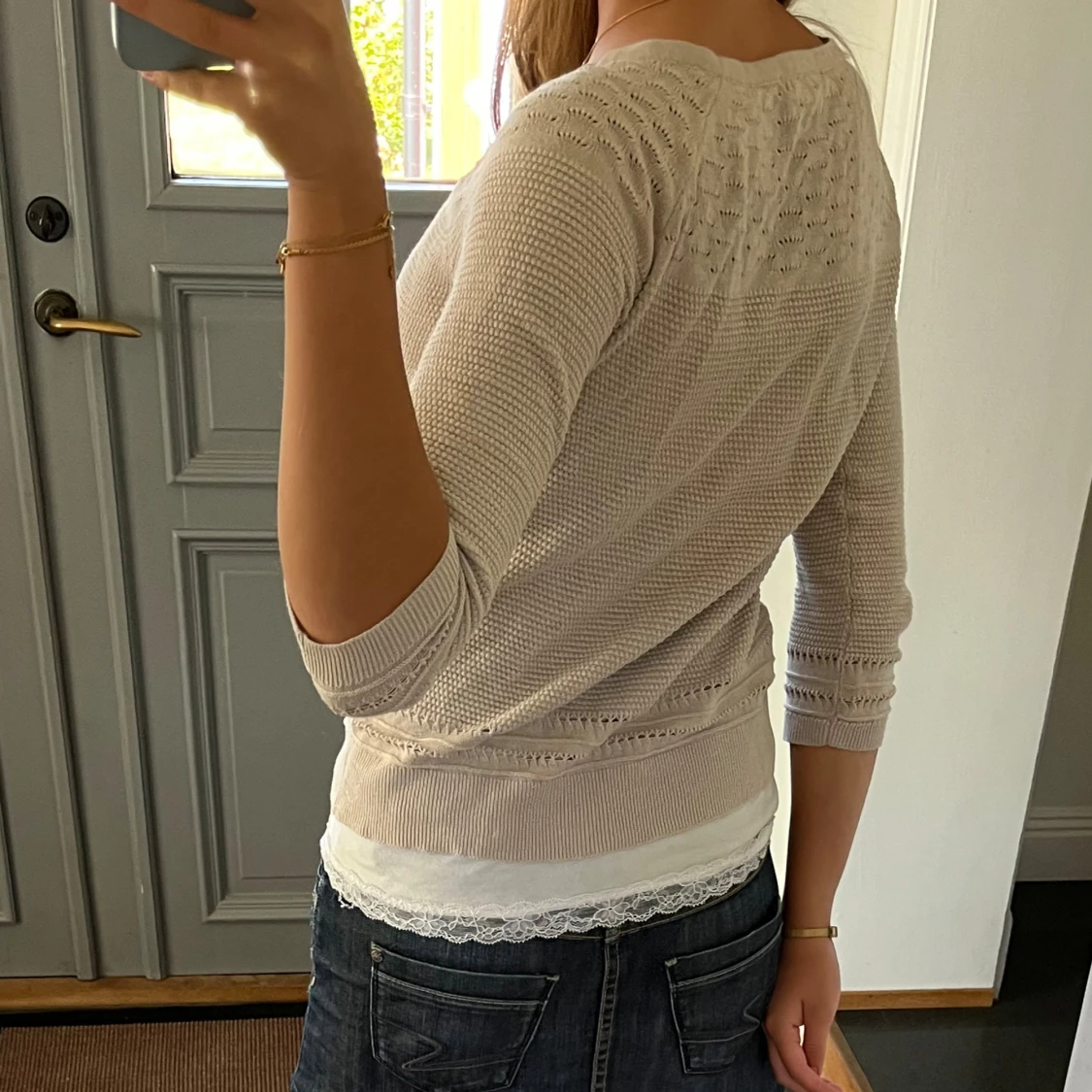 Trekvartsärmad beige stickad kofta från H&M i storlek S. Fint skick. Använd gärna köp nu!