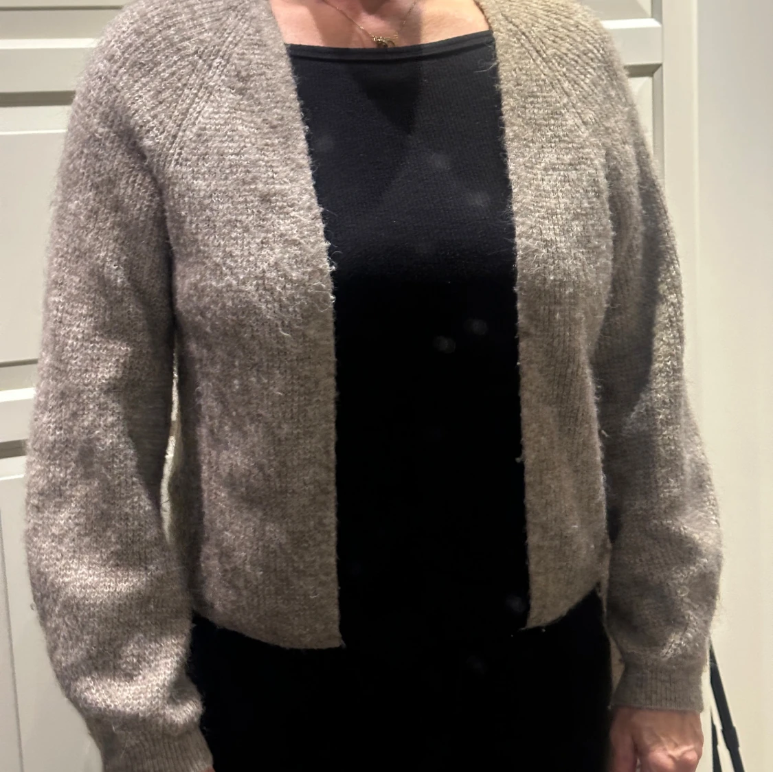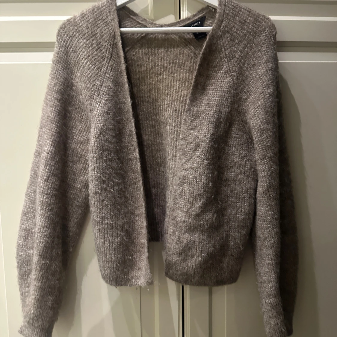 Mysig beige stickad kofta från Lindex med öppen front och lång ärm. Lite nopprig men går nog att få bort. Skulle ej säga att den känns som en XS på utan är ganska stor i storleken, men är ganska kort.