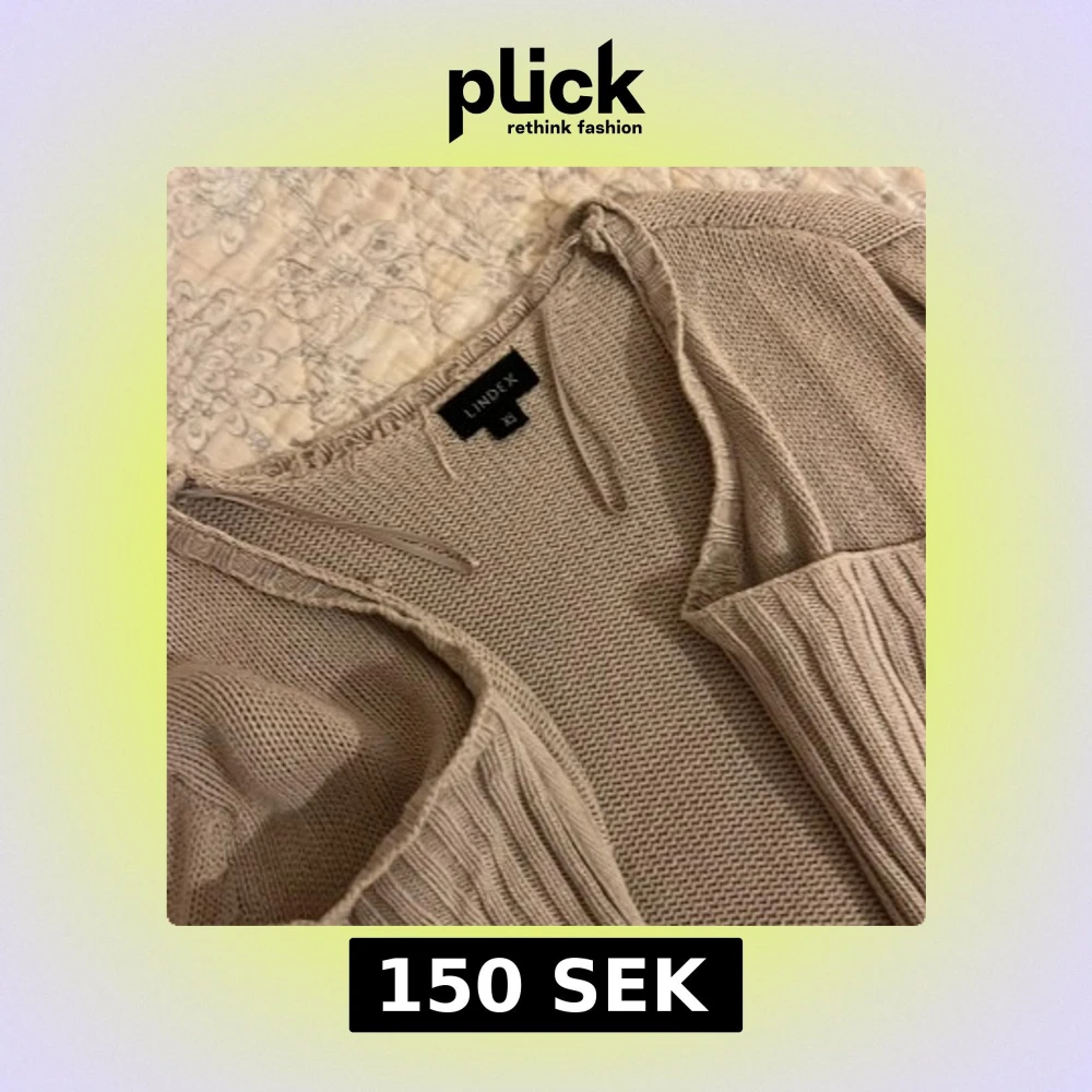 Säljer en beige stickad kofta från Lindex i xs. Koftan har långärmad design, öppen framtill och ribbade partier längs kanterna.