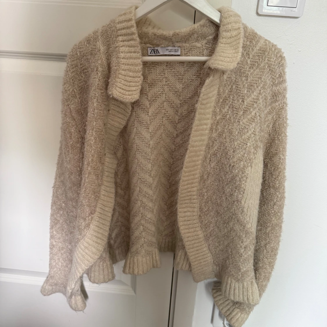 Mysig beige stickad kofta från Zara med snyggt sicksackmönster. Koftan har bred ribbad krage och muddar vid ärmslut och nederkant.