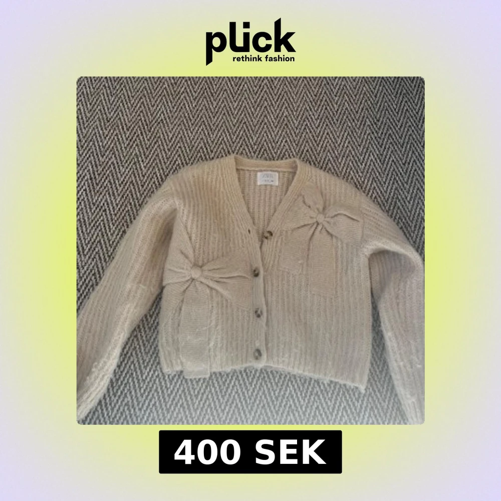 Säljer en mysig beige stickad kofta från Zara med dekorativa rosetter framtill. Koftan har en v-ringad design och knappar längs framsidan.