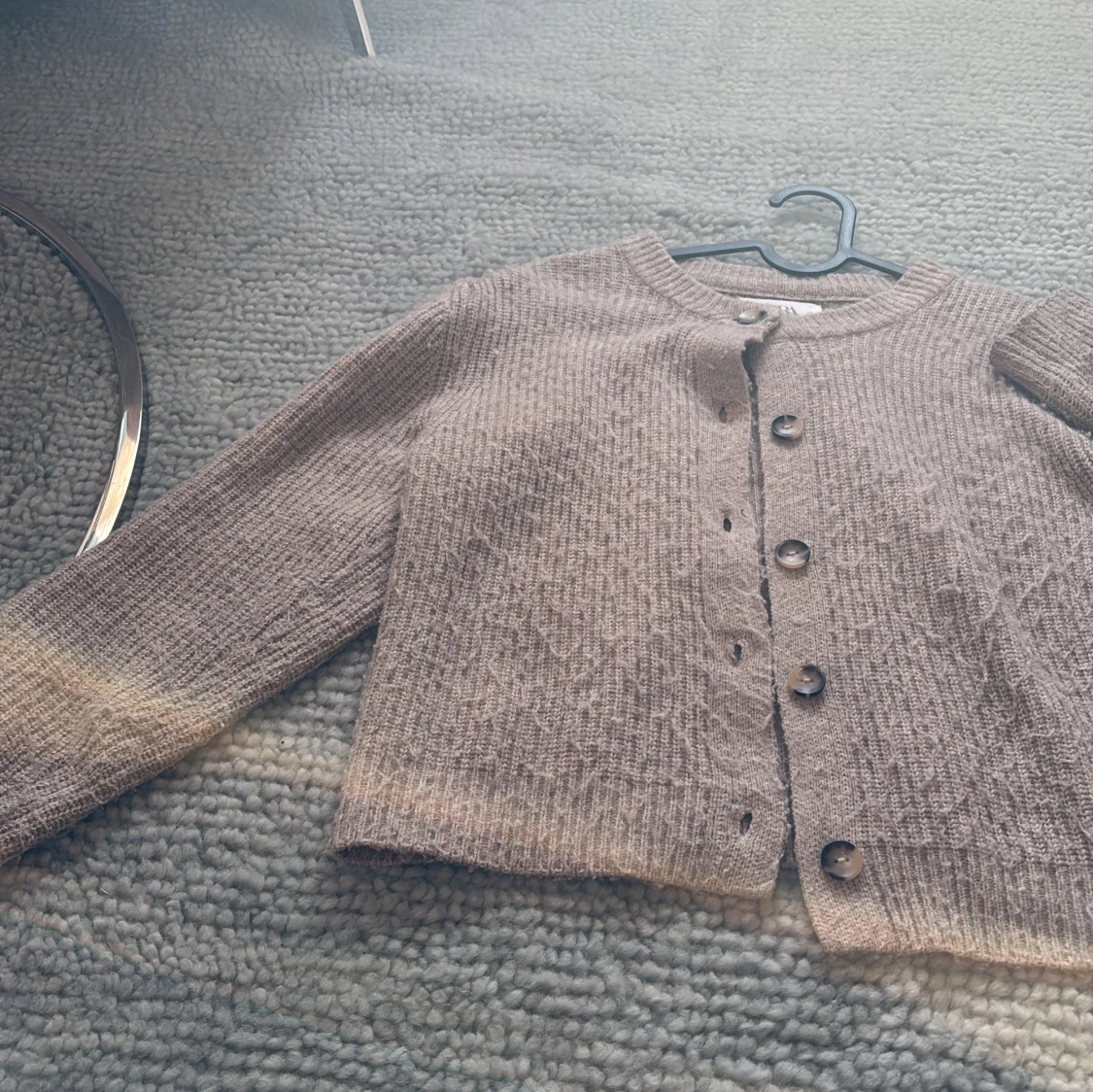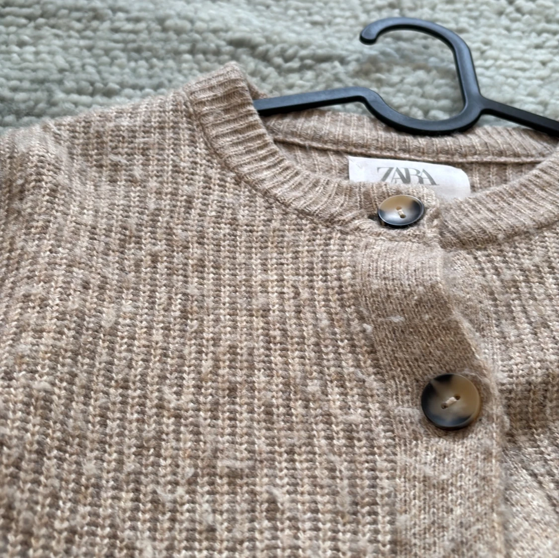 Mysig beige stickad kofta från Zara med rund halsringning och stora knappar framtill. Koftan har långärmad passform och är perfekt att slänga över en t-shirt eller linne. Den ribbade strukturen ger en trendig och avslappnad vibe.
