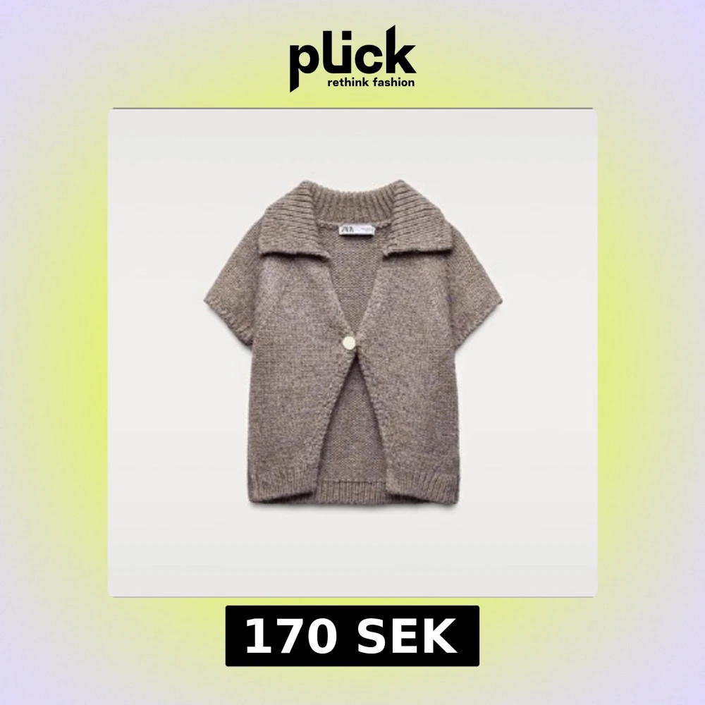 Kortärmad stickad kofta från Zara i beige nyans. Koftan har en bred krage, ribbade detaljer vid ärmslut och nederkant samt en knapp framtill. Perfekt för lager-på-lager och chill stil.