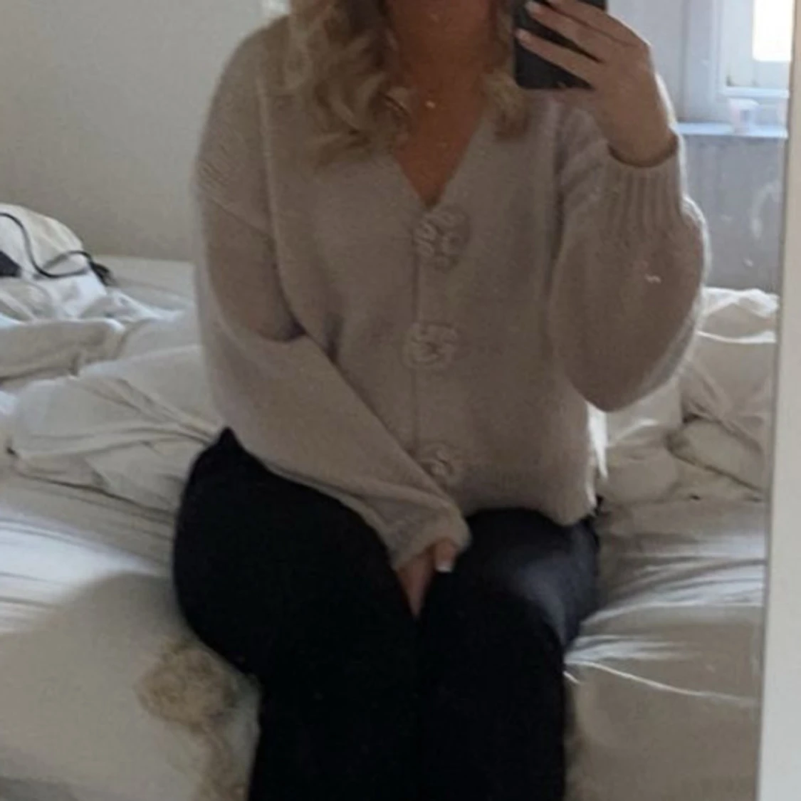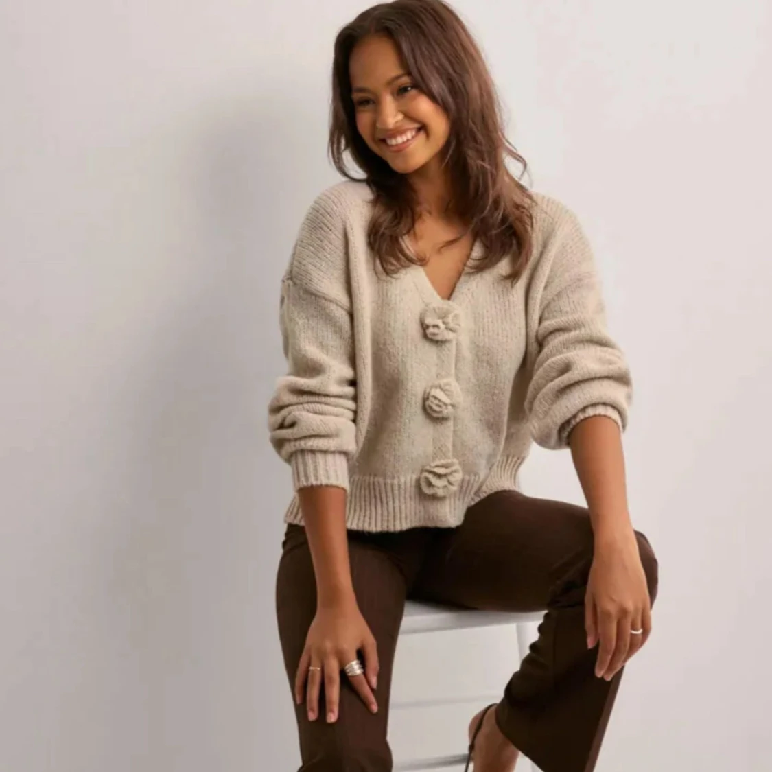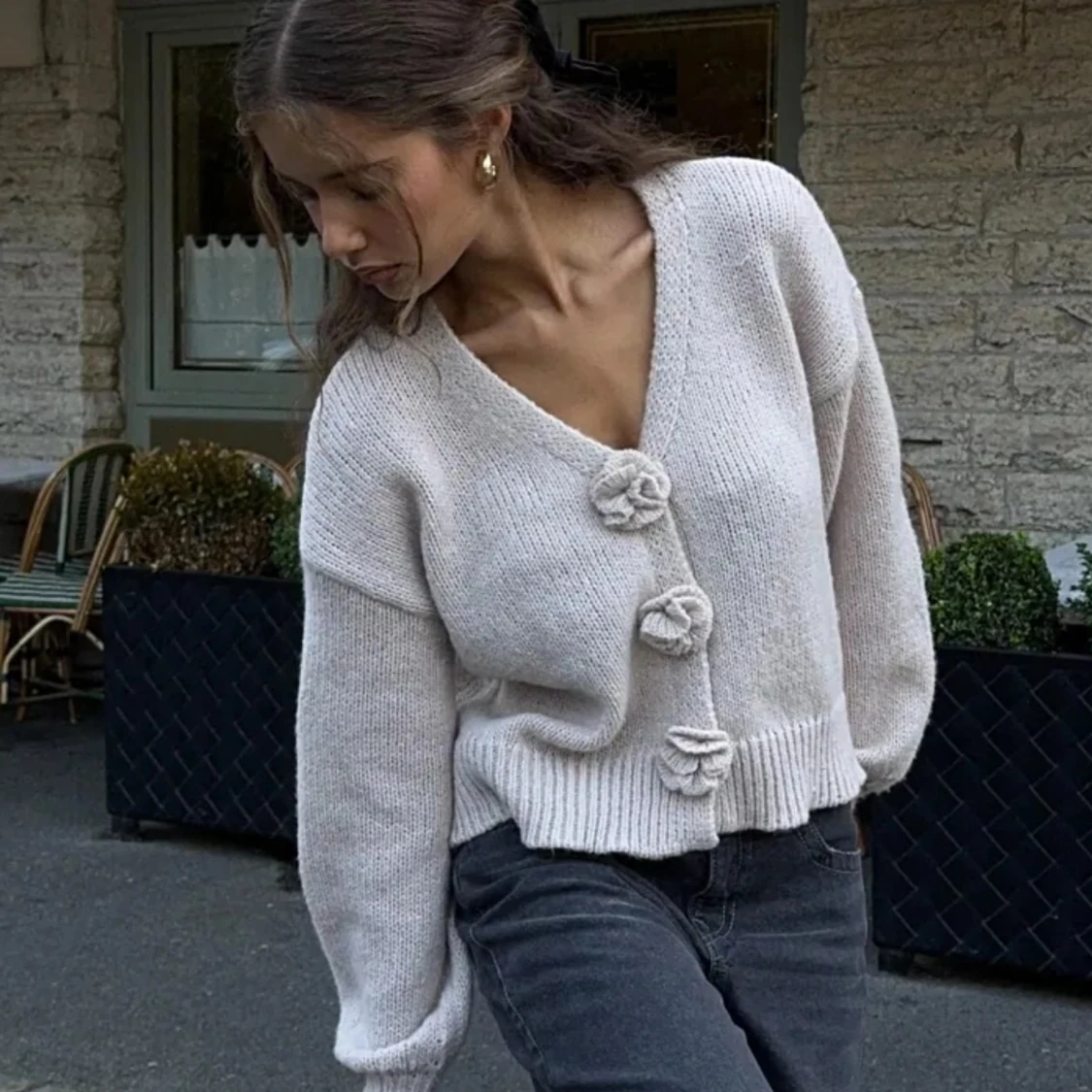 Superfin beige stickad kofta med v-ringning och dekorativa blommor som knappar framtill. đ©·đ©·
