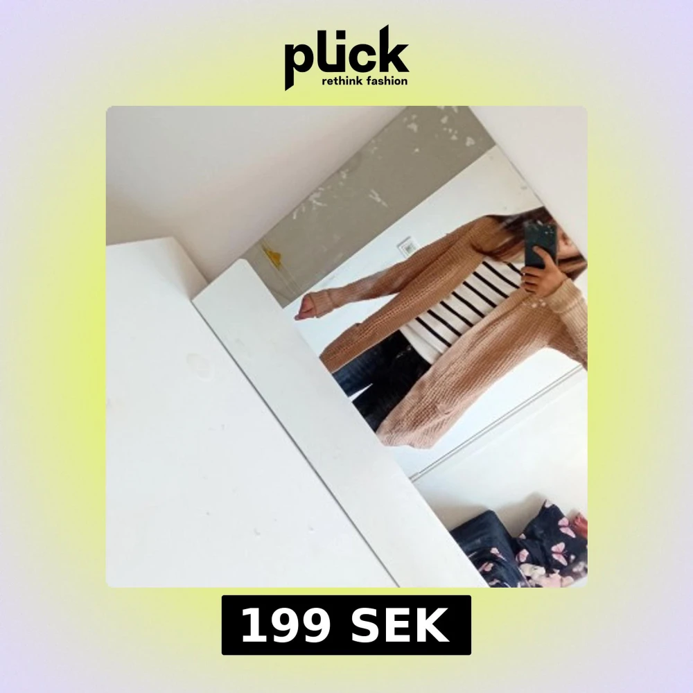 Säljer en beige stickad kofta med lång ärm och två praktiska fickor framtill. Koftan har en loose passform och är perfekt att slänga över en t-shirt eller topp. Den är mjuk och har ett grovt stickat mönster som ger en chill vibe.
