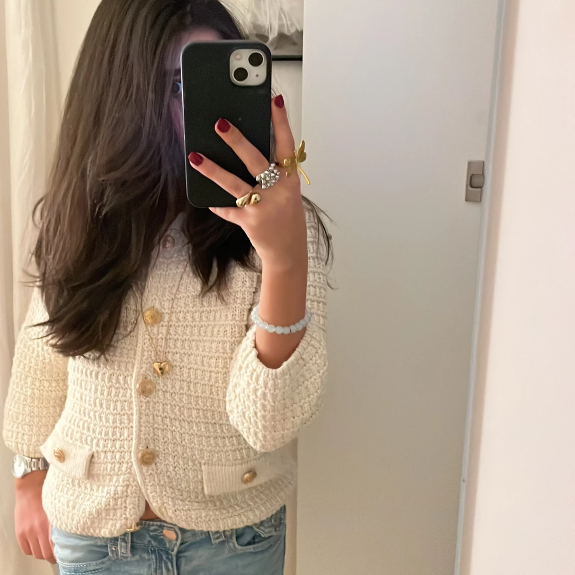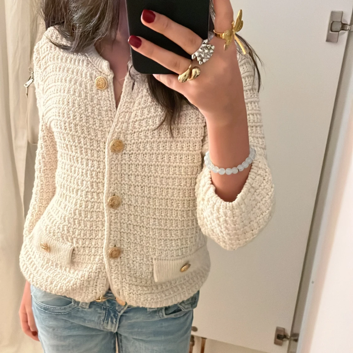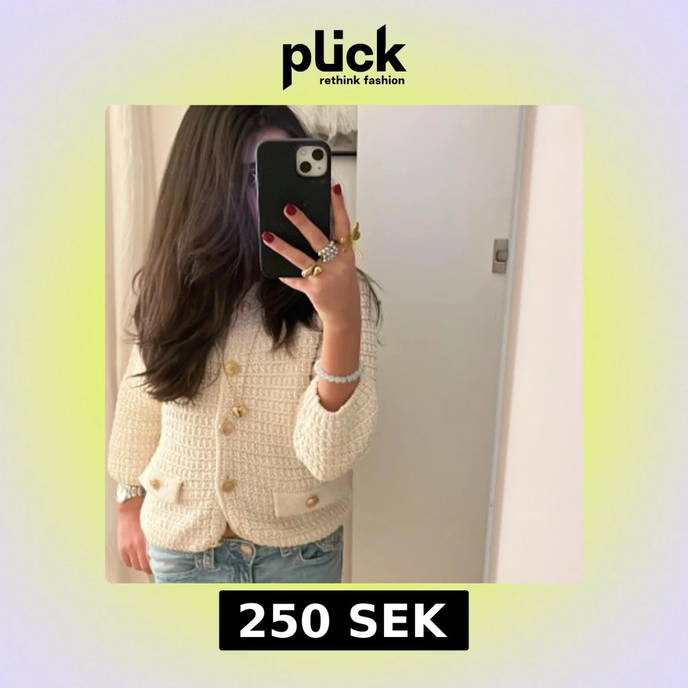 Säljer en jättefin kofta med guldknappar som är oanvänd. Den är i storlek S men passar även till tjejer med mindre storlekar i koftor.💕💕💕