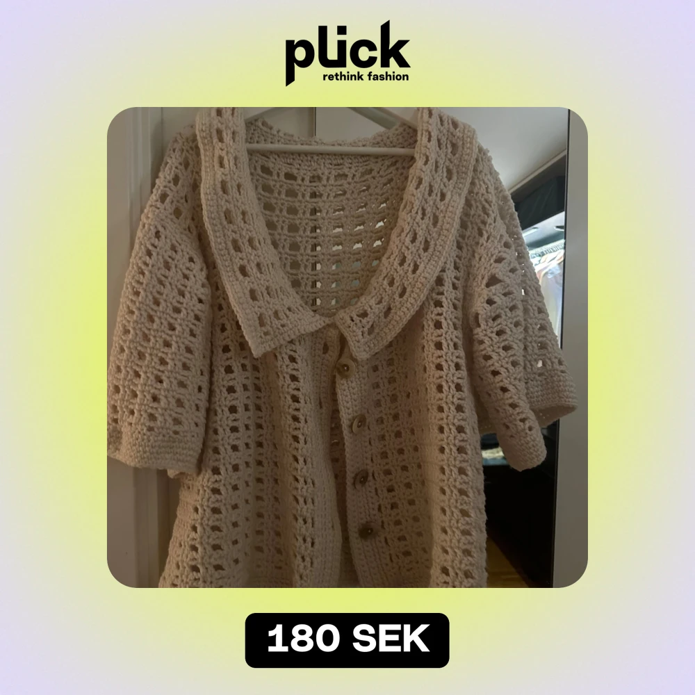 Mysig beige stickad kofta med stora knappar framtill. Den har en luftig design med trekvartsärmar och en bred krage. Perfekt för en avslappnad stil hemma eller en sval sommarkväll. 🧶✨
