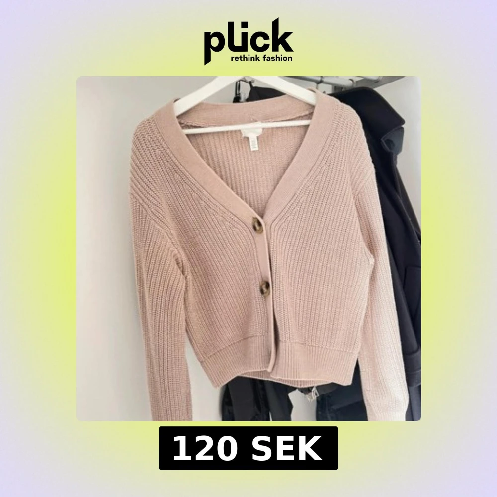 Superfin beige stickad kofta med två stora knappar framtill och v-ringad hals. Koftan har lång ärm och en lite croppad passform som ger en trendig look. Perfekt att slänga över en topp för en chill och snygg outfit.