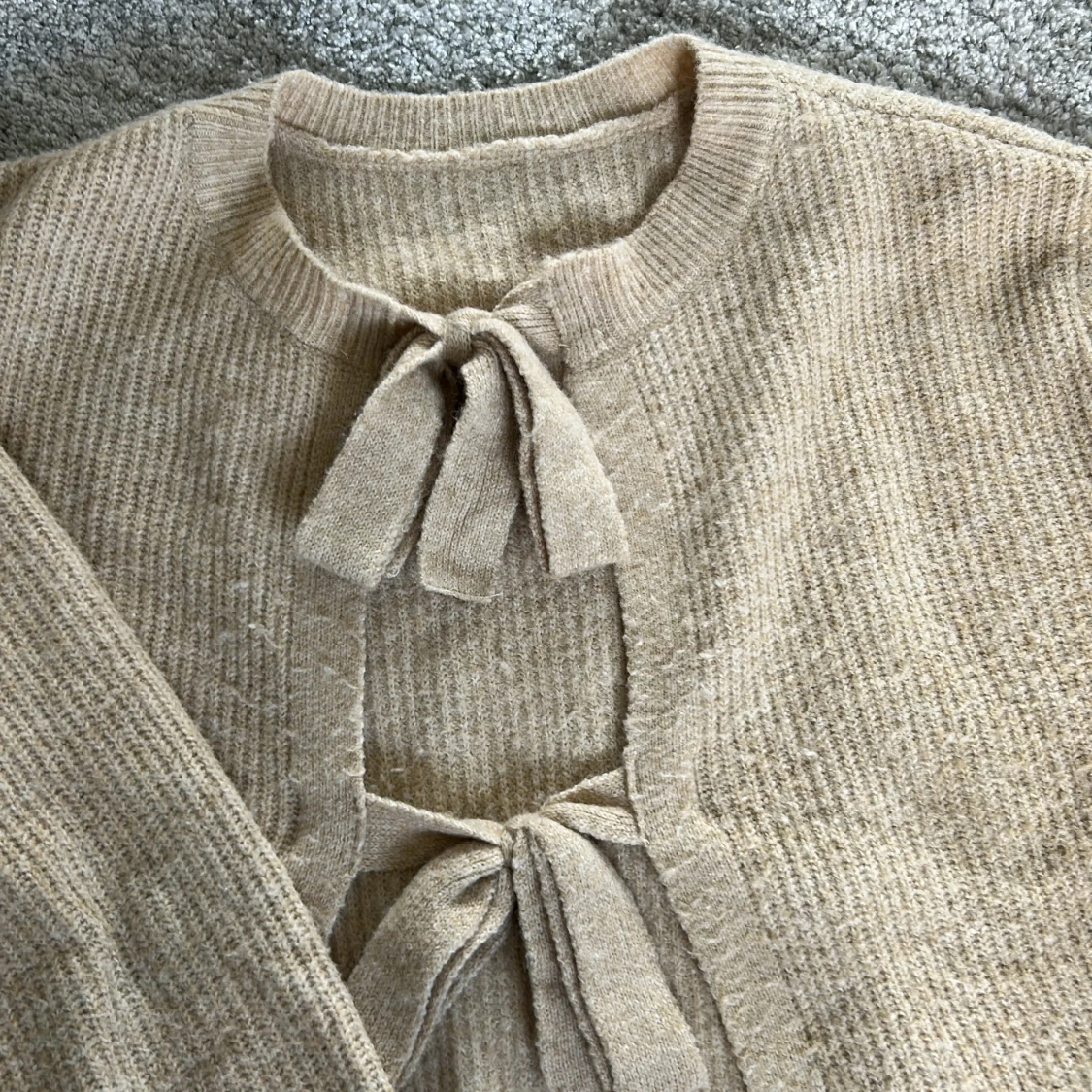 Superfin beige stickad kofta med två knyt framtill. Koftan har lång ärm och ribbad struktur❤️