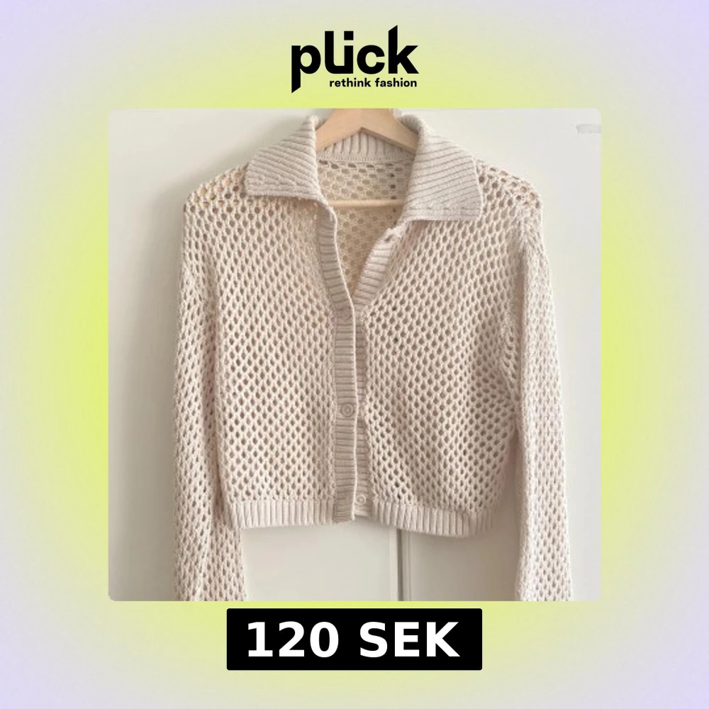Säljer en beige stickad kofta med hålmönster och ribbad krage. Koftan är croppad, har långa ärmar och knäpps framtill med knappar. Perfekt för lager-på-lager och ger en chill vibe till din outfit.