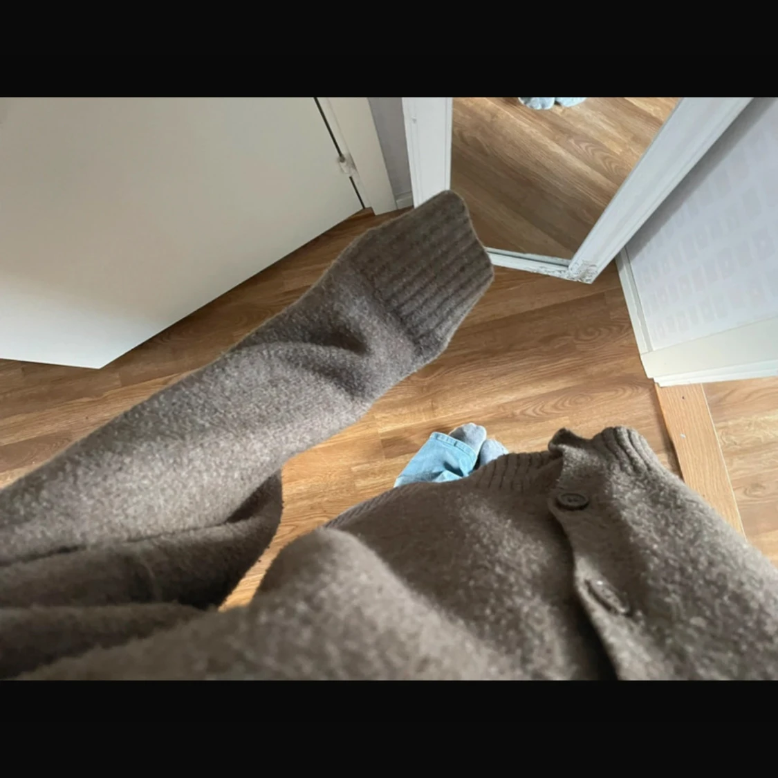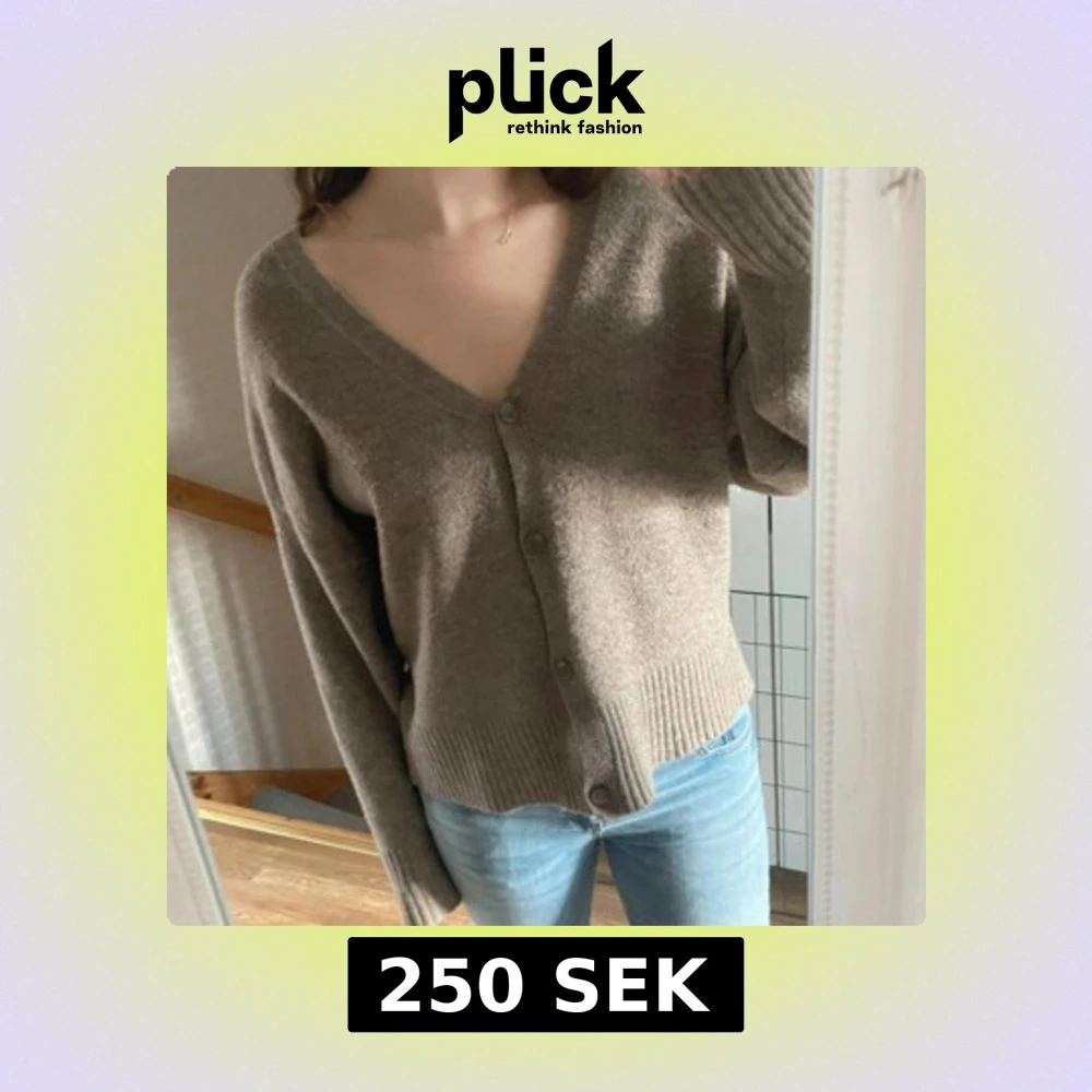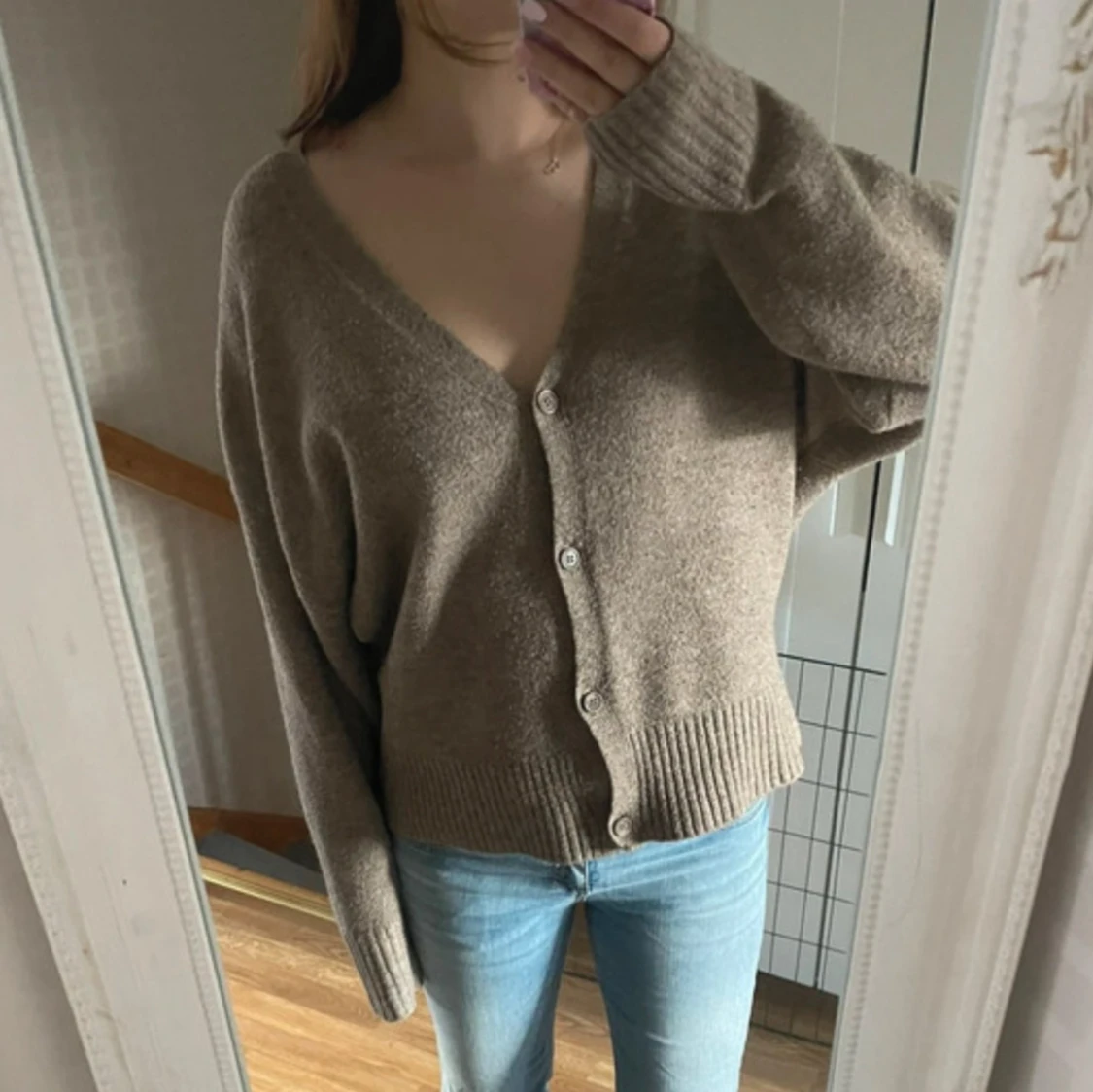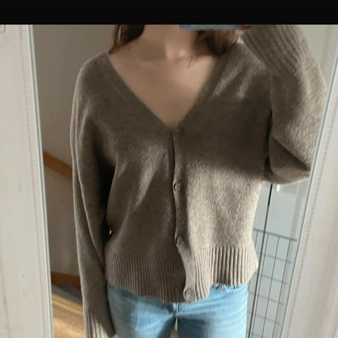 Mysig beige stickad kofta med djup v-ringning och knappar framtill. Koftan har långa ärmar med breda ribbade muddar och en avslappnad passform. Perfekt att slänga på sig över en t-shirt eller linne för en chill look.