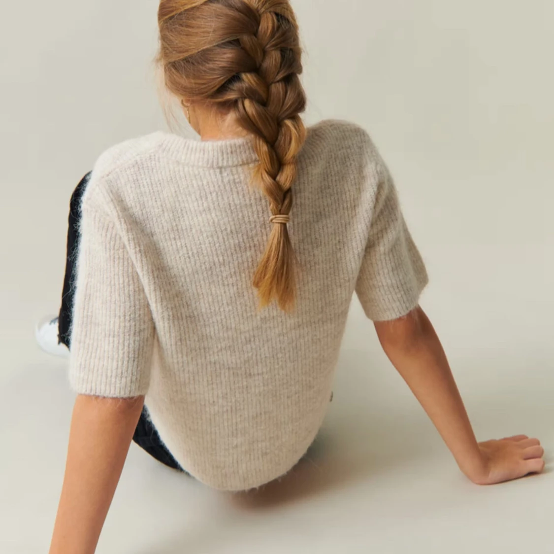 Säljer en mysig beige stickad kofta med knappar framtill. Koftan har trekvartsärmar och en rund halsringning. Perfekt för en stilren och bekväm look. STORLEK 170 🩷