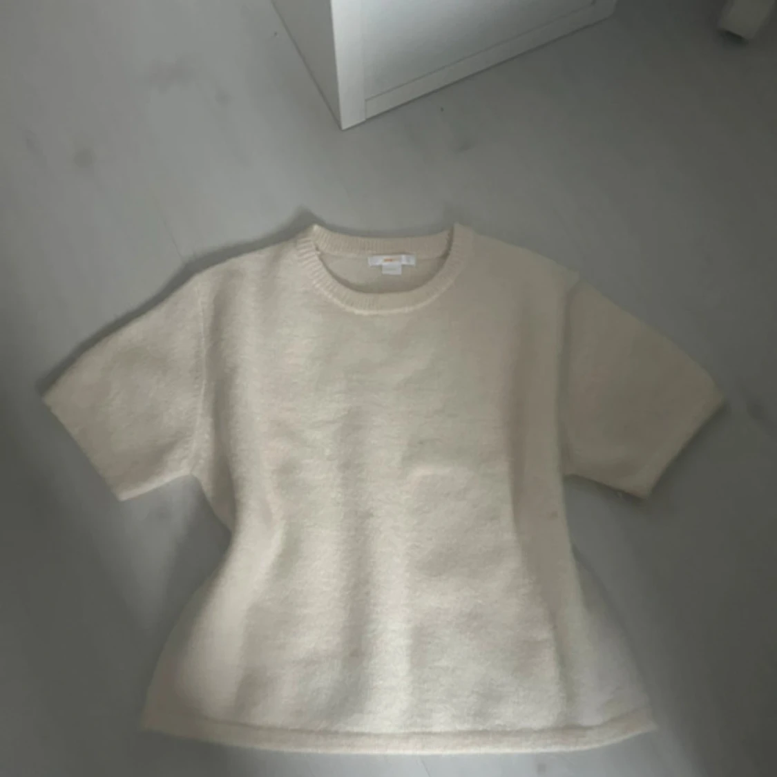 Supermysig beige stickad tröja från Arket med rund hals och korta ärmar. Perfekt för lager-på-lager och har en enkel, clean look som funkar till jeans eller kjol. Materialet är mjukt och ger en chill vibe. Snygg att styla med smycken eller över en skjorta. Storlek 158/164 men passar xxs-s💞