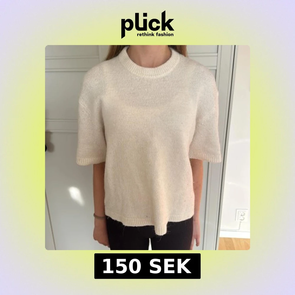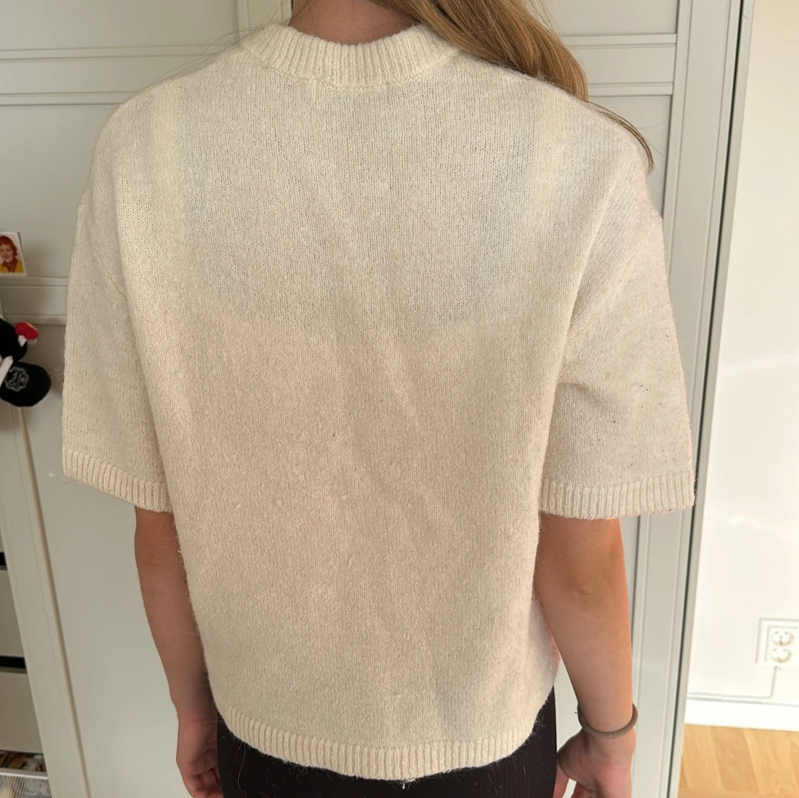 En enkel och stilren beige stickad tröja med korta ärmar och rund hals. Tröjan har ribbade kanter vid hals, ärmslut och nederkant. Perfekt för lager-på-lager och funkar året runt för en chill look.