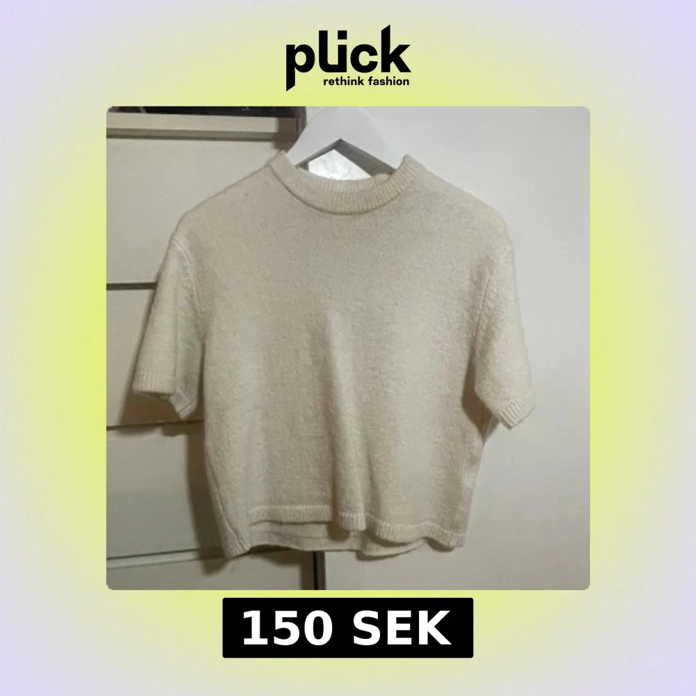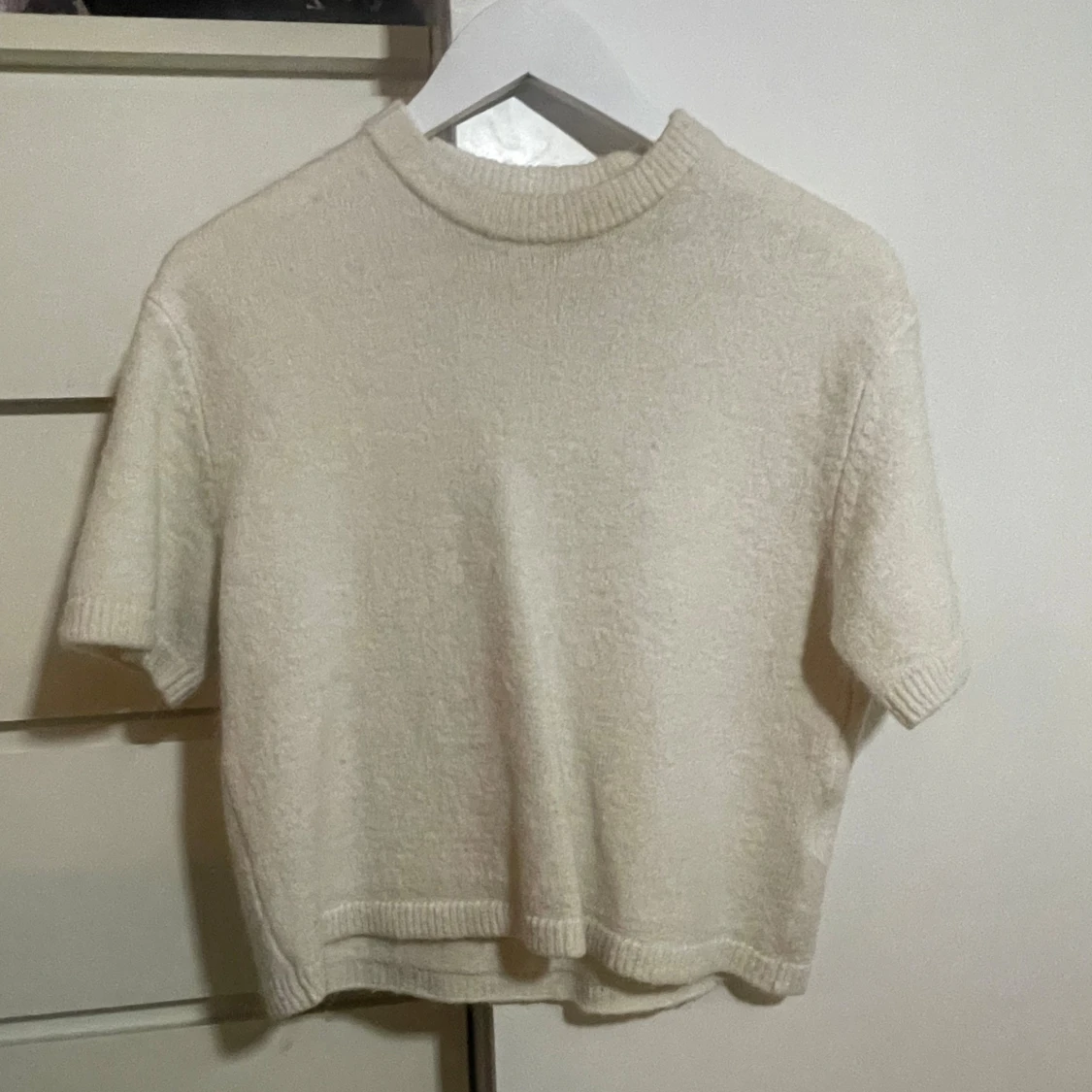 Supermjuk och enkel beige stickad tröja med korta ärmar och ribbade kanter vid hals, ärmslut och nederkant. Perfekt för lager-på-lager och chill. Säljer då den inte används längre. Pris kan diskuteras💞
