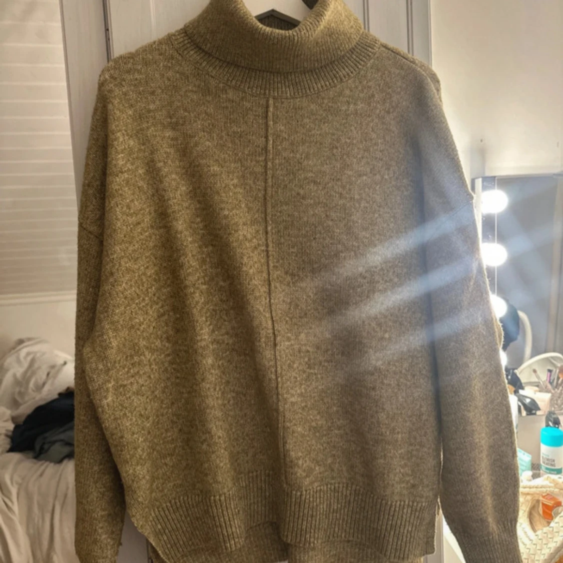 Mysig beige stickad polotröja med oversized passform och lång ärm. Tröjan har en hög krage och synlig söm framtill som ger en cool detalj. Perfekt för lager-på-lager under kyliga dagar.