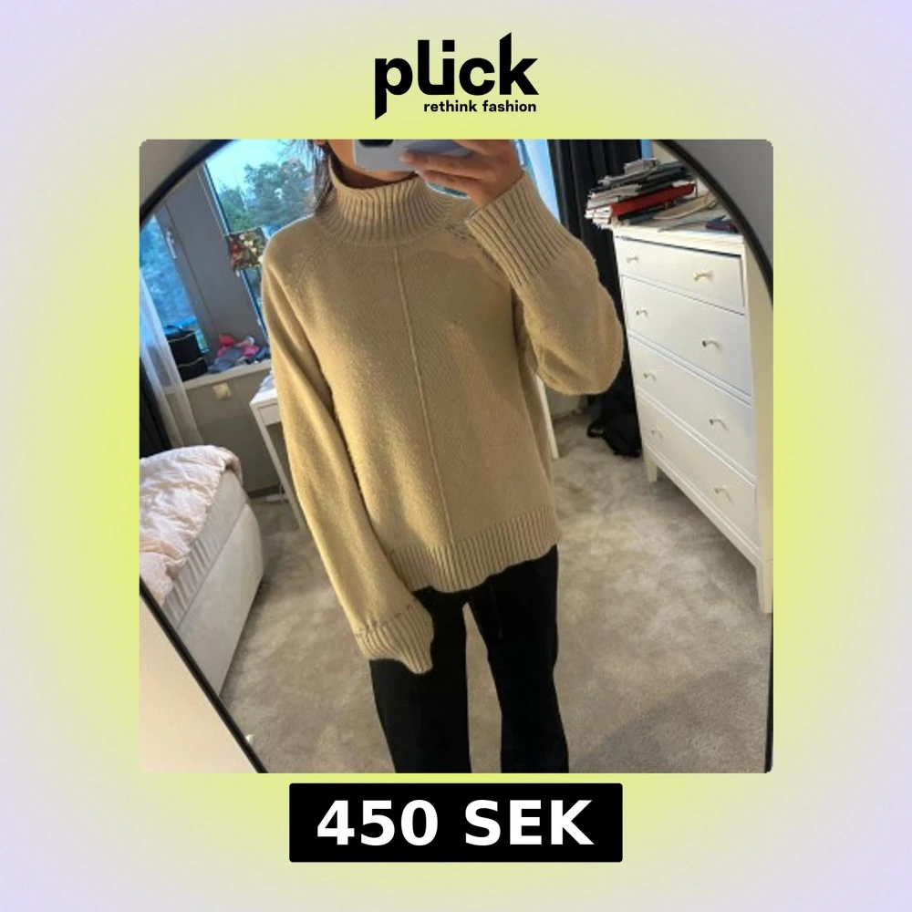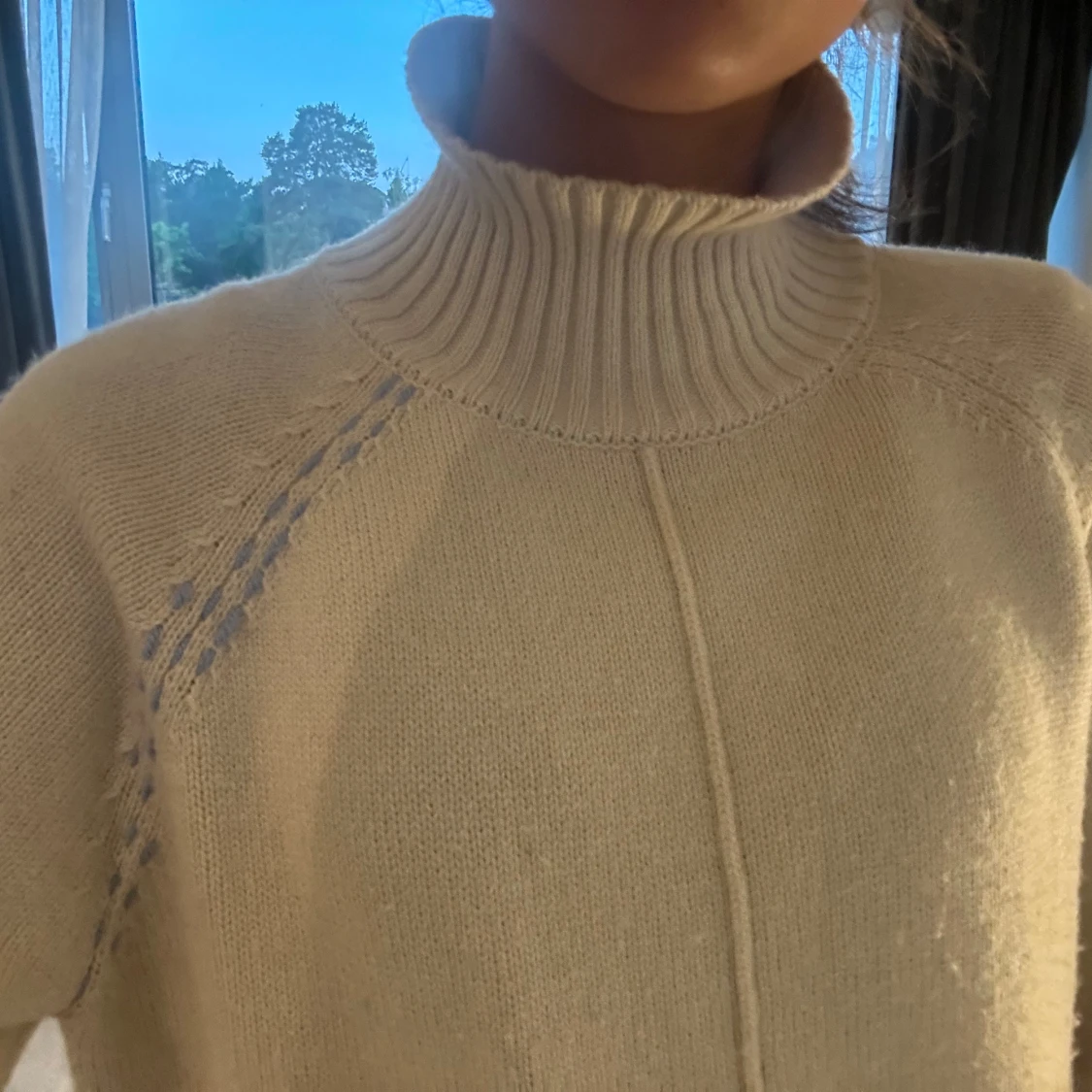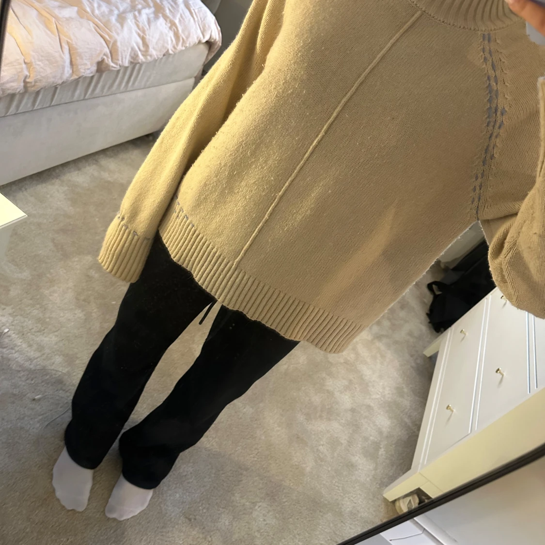 Säljer en skit snygg beige stickad polotröja med hög ribbad krage och raglanärmar. Snygg detaljsöm framtill och längs axlarna. Tröjan sitter mer oversized🥰