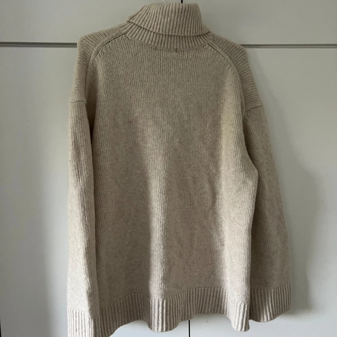 Säljer en supermysig beige stickad polotröja. Den är perfekt för kalla dagar med sin höga krage och långa ärmar. Tröjan är i bra skick och har en normal passform. Perfekt för höst och vinter! 🍂❄️