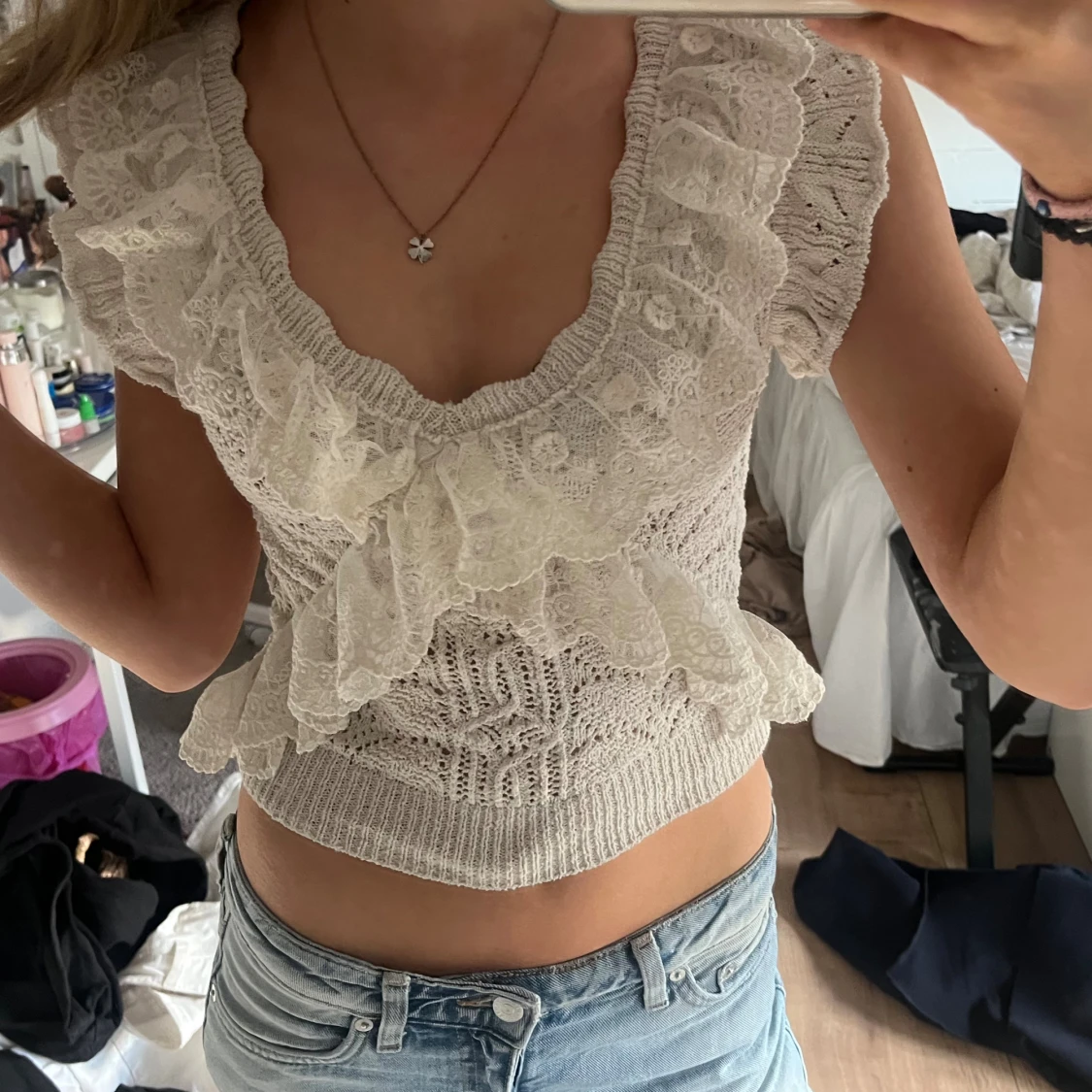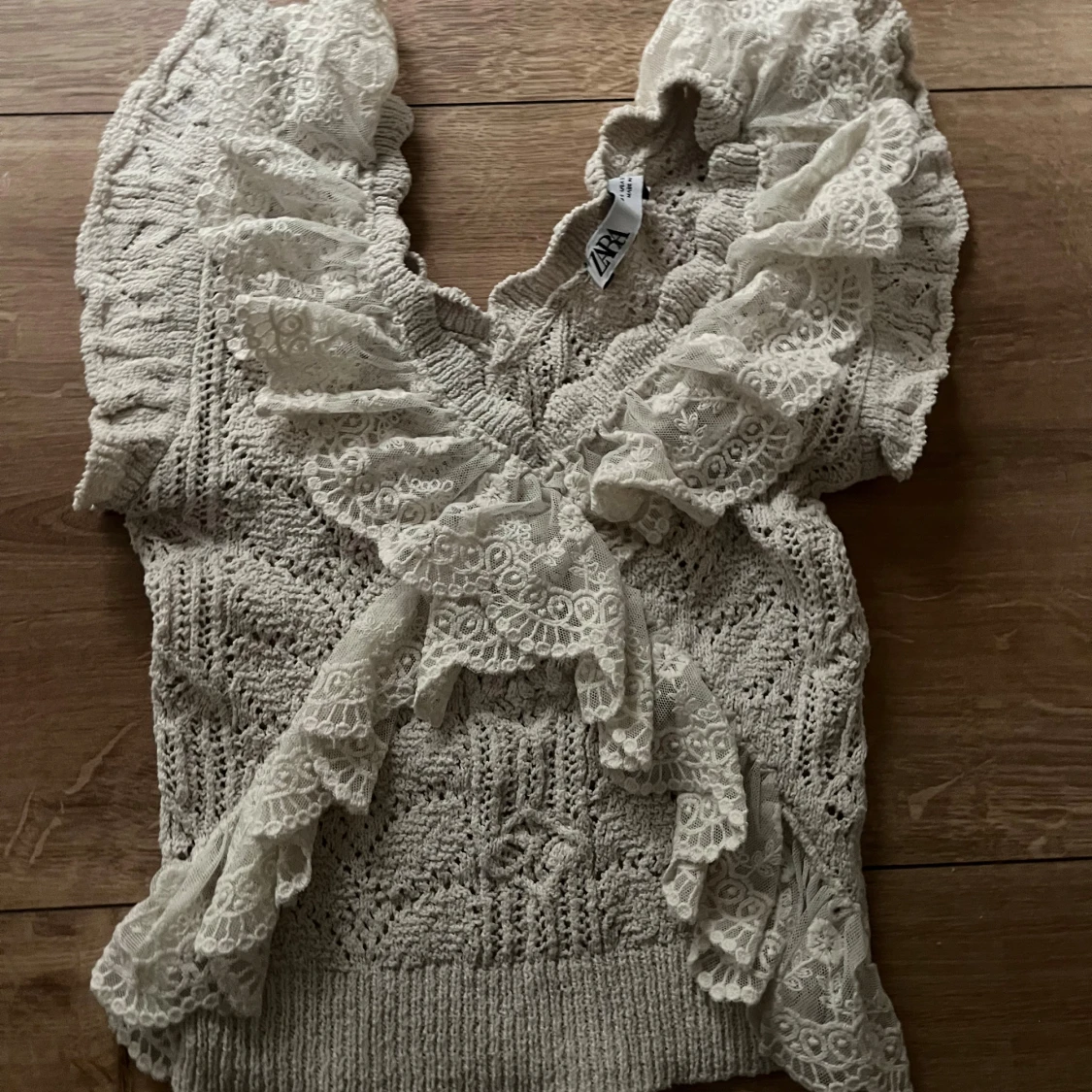 Supersöt beige stickad topp från Zara med v-ringning och breda volanger i spets längs axlar och framstycke. Har använt ungifär 3 gånger och den är som ny säljer för 200 men priser kan dirkuteras(köpte den för 500kr💓