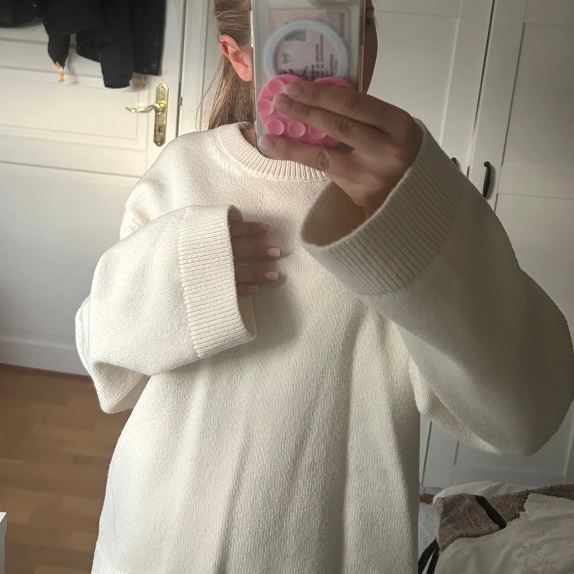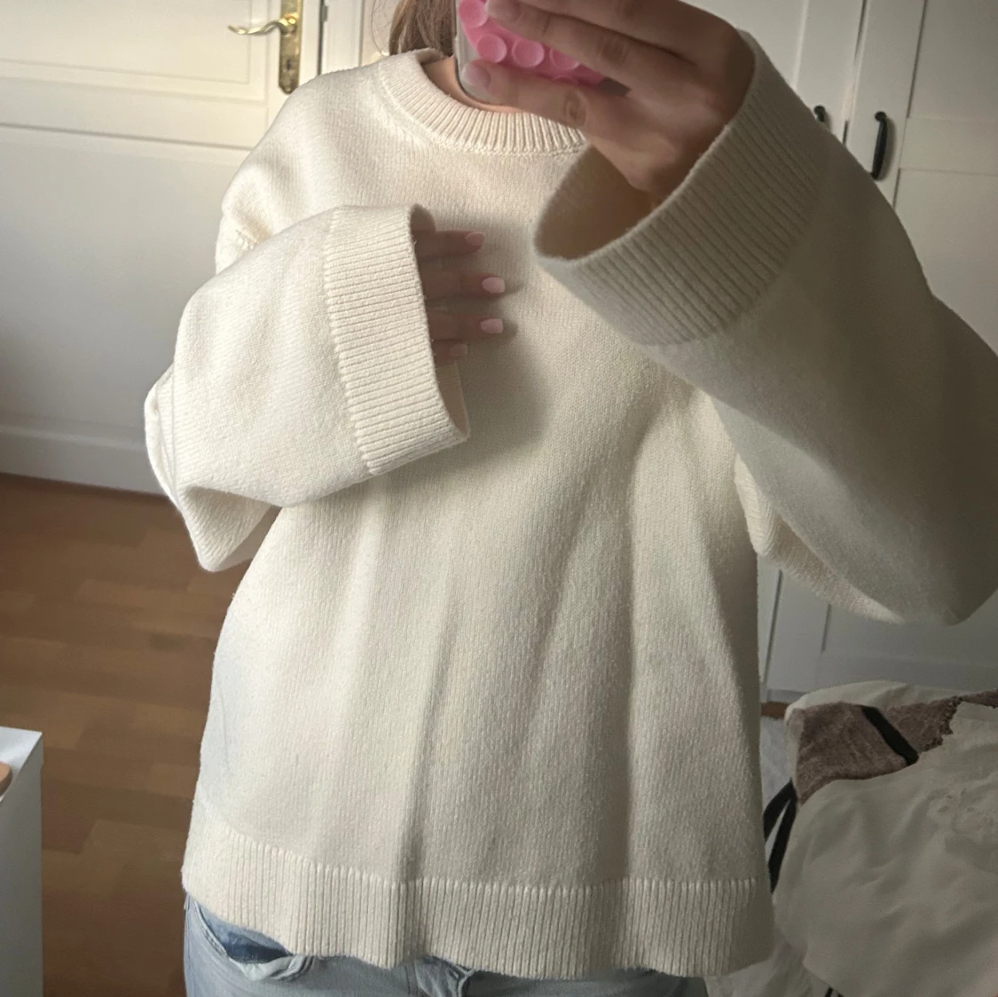 Supermysig stickad tröja i beige färg med breda muddar vid ärmslut och nederkant. Tröjan har en klassisk rund halsringning och långa ärmar, perfekt att slänga på sig för en chill look.