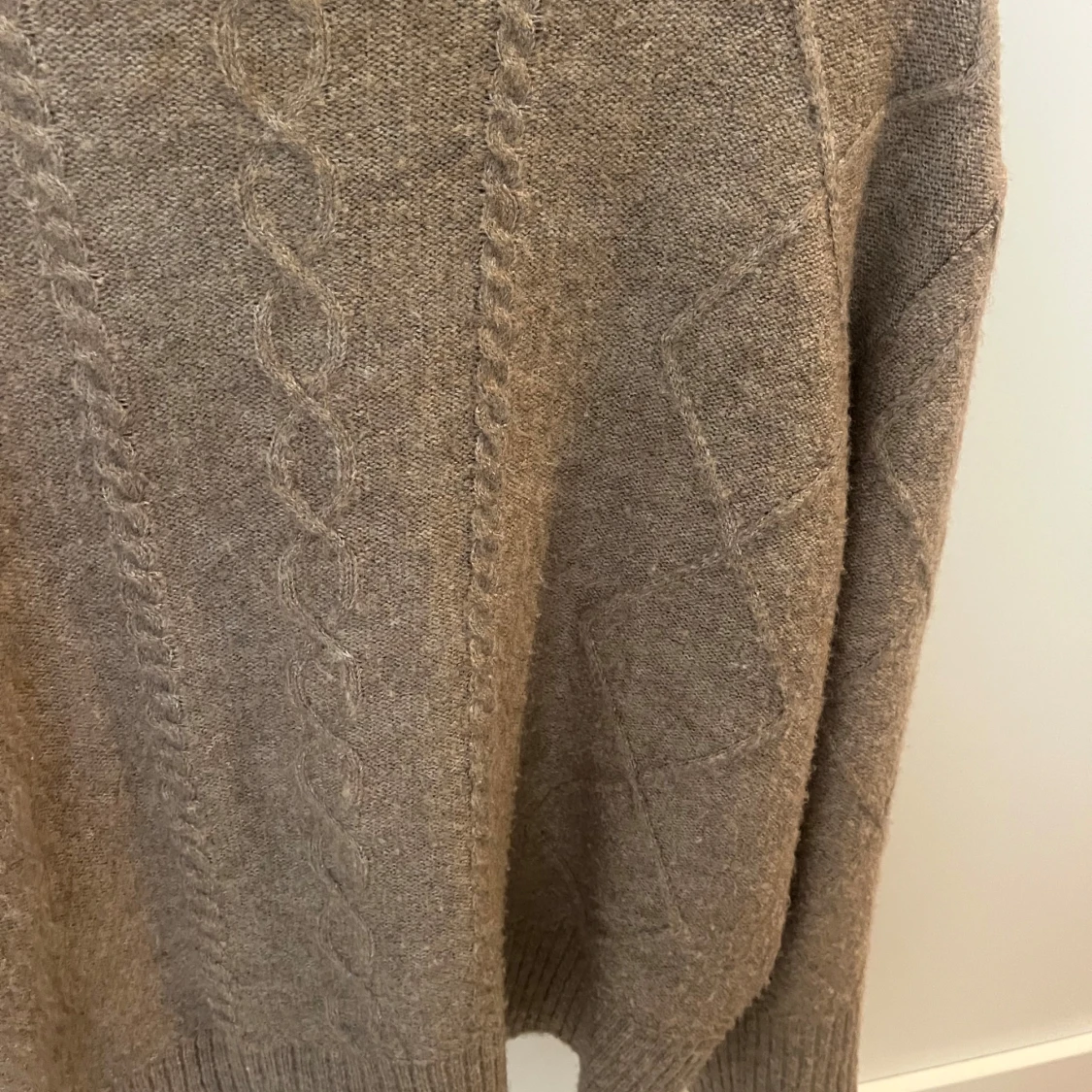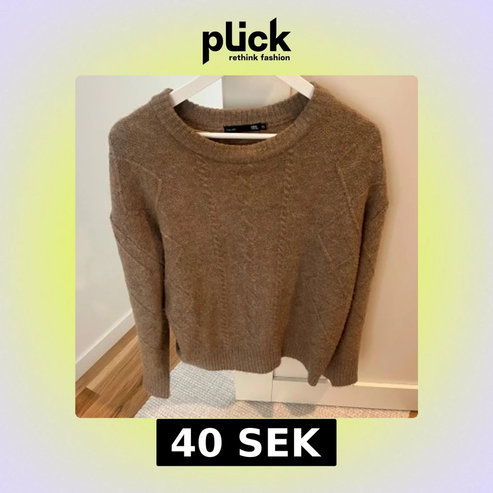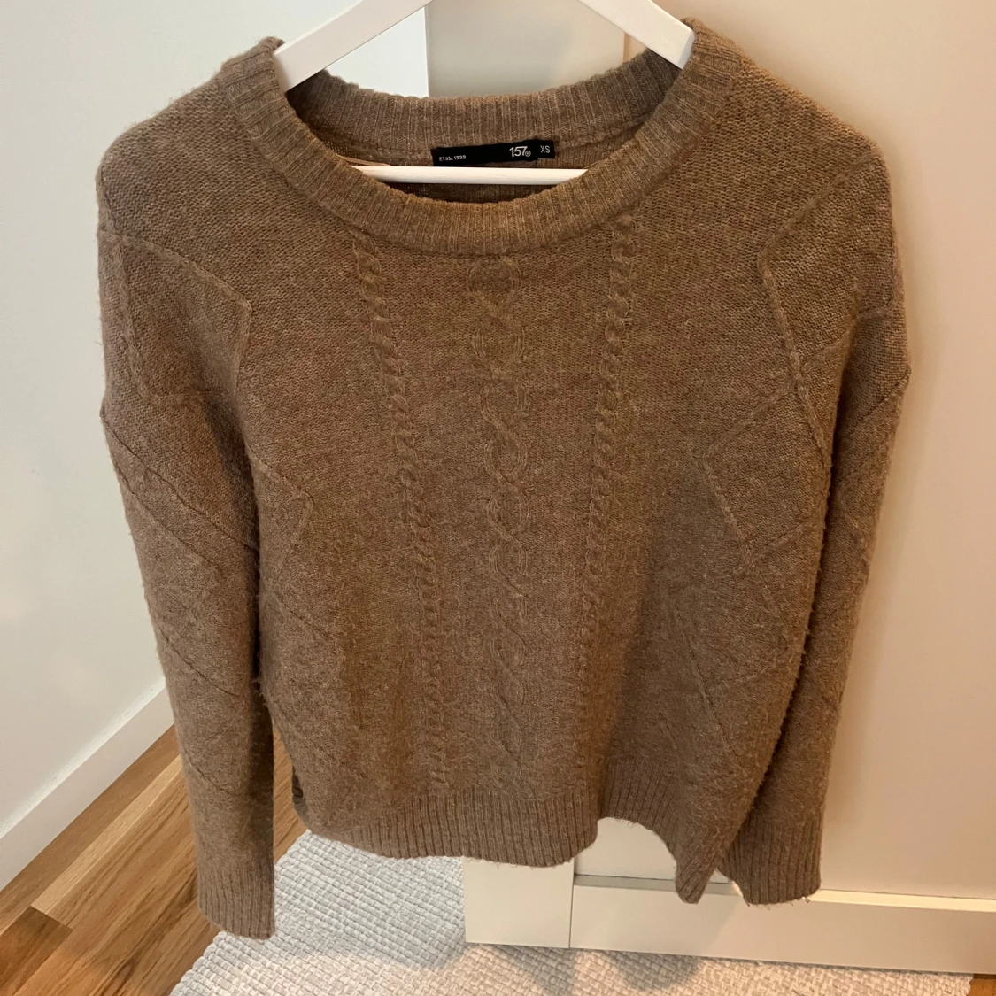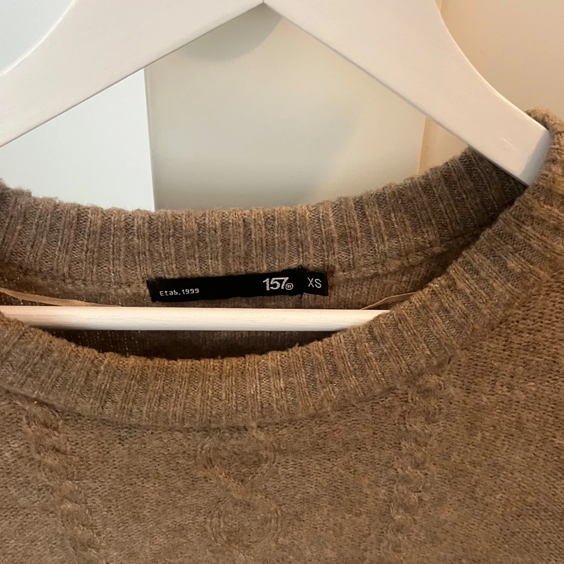 Mysig beige stickad tröja från Lager 157! Tröjan har ett kabelstickat mönster framtill och ribbade muddar vid ärmslut och nederkant.