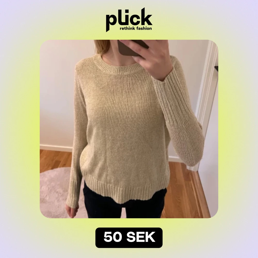 Säljer en supermysig beige stickad tröja. Den är perfekt för kyliga dagar med sin långa ärmar och ribbade kanter. Tröjan har en enkel och stilren design som passar till allt. Perfekt för både vardag och mysiga hemmakvällar!