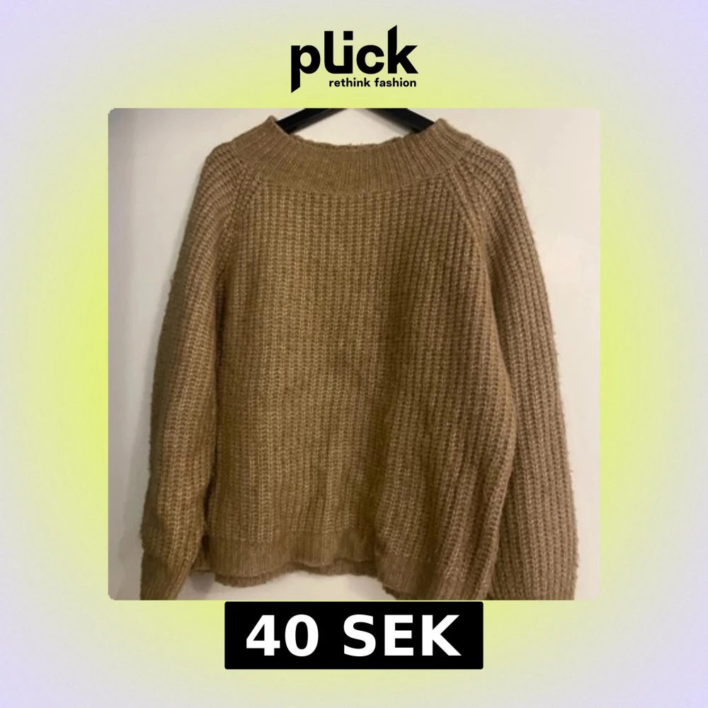 Mysig beige stickad tröja med grov struktur och bred ribbad kant vid halsen. Tröjan har lång ärm och en avslappnad passform. Gott skick!