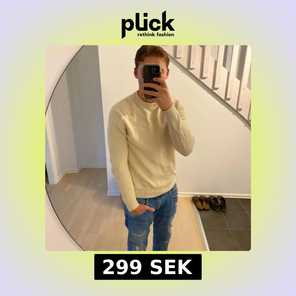 Säljer en stilren beige stickad tröja. Tröjan har rund halsringning, ribbade muddar och är långärmad. Perfekt för lager-på-lager och funkar till jeans eller chinos. Enkel och clean design som passar till många outfits.