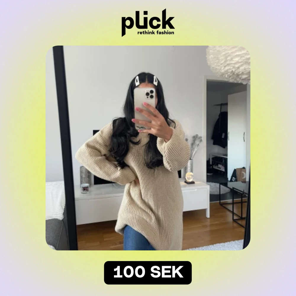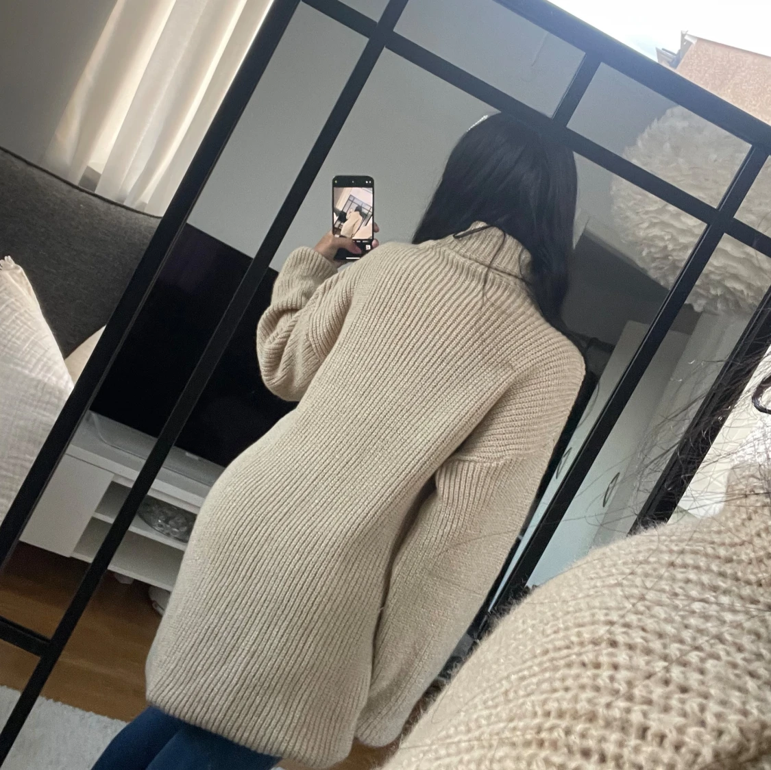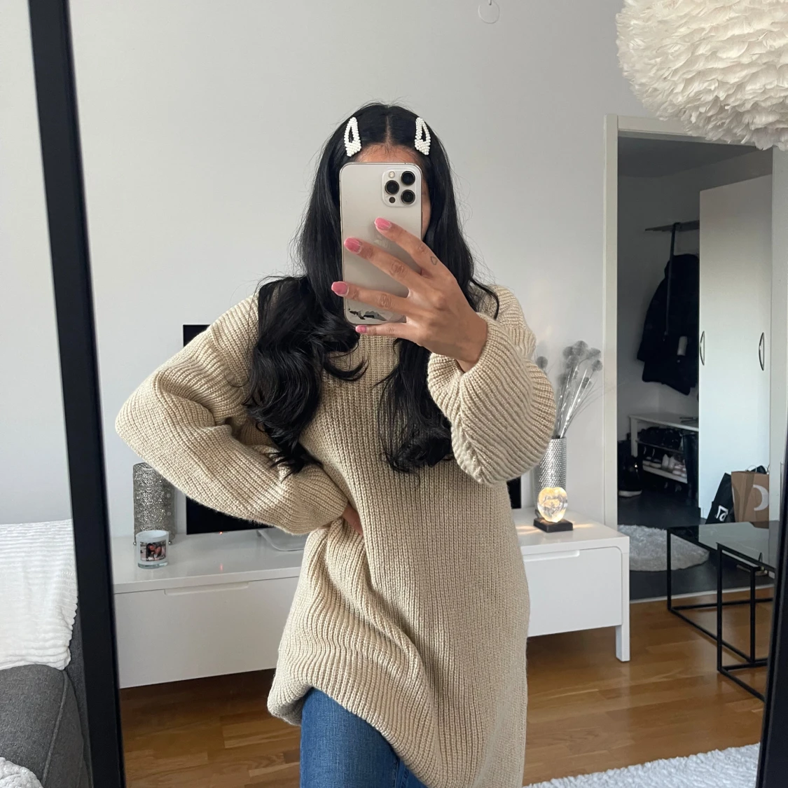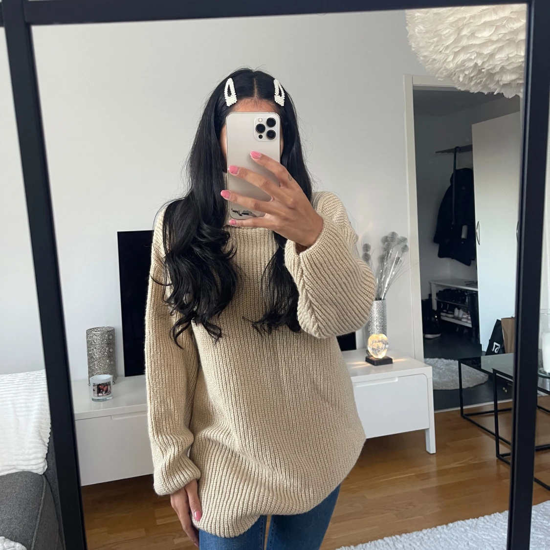 Säljer en supermysig beige stickad tröja som är perfekt för kyliga dagar.