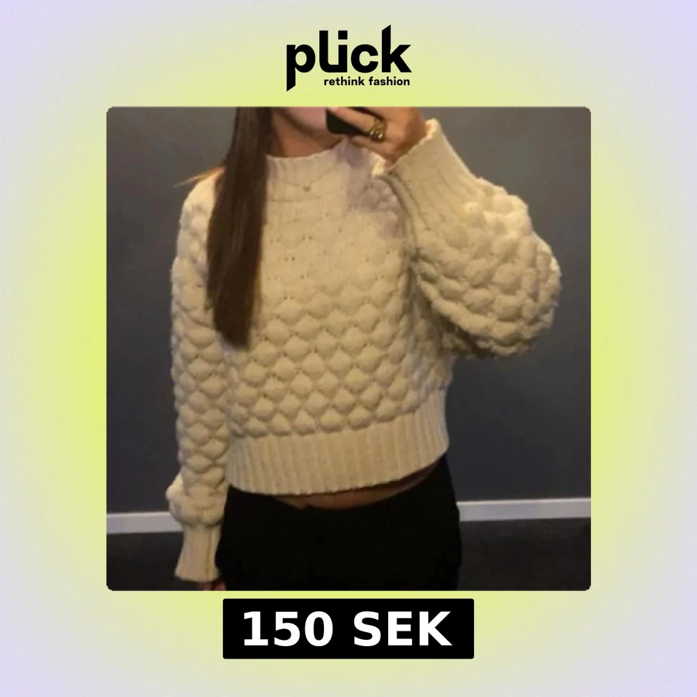 Säljer en mysig beige stickad tröja med ett unikt bubbligt mönster. Tröjan är croppad och har långa ärmar med ribbade muddar. Perfekt för kyliga dagar!