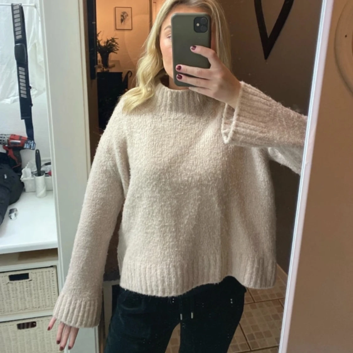 Mysig beige stickad tröja med långa ärmar och ribbade detaljer vid ärmslut och nederkant. Perfekt för kyliga dagar.