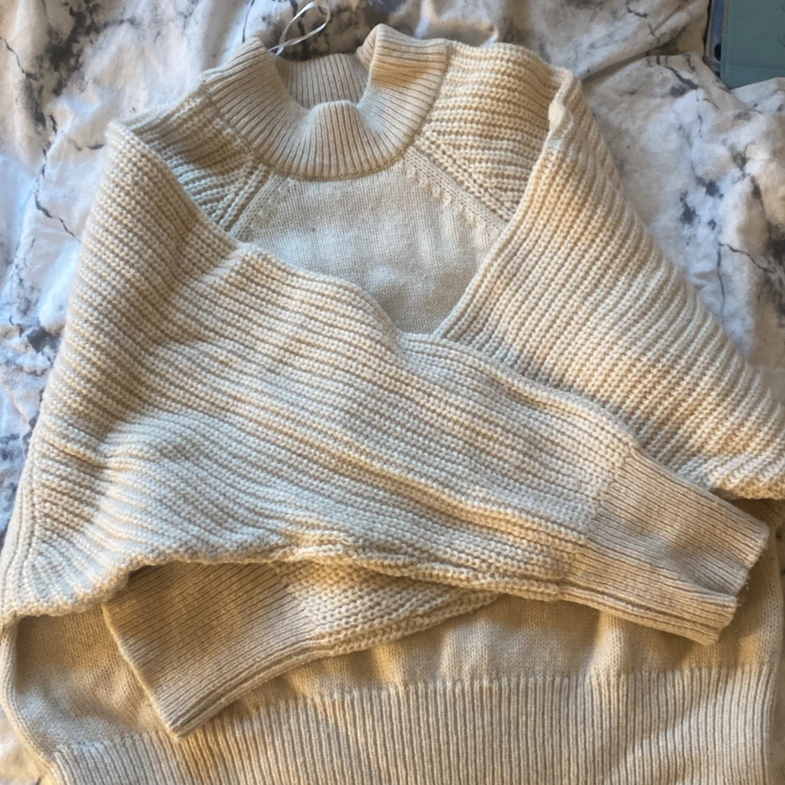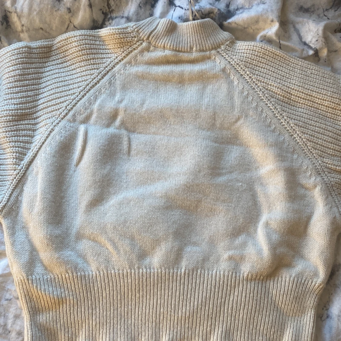 Säljer en mysig beige stickad tröja med ribbade detaljer. Tröjan har långa ärmar och en rund halsringning. Perfekt för kyliga dagar och enkel att matcha med olika outfits. Sälja på grund av att man inte använder längre