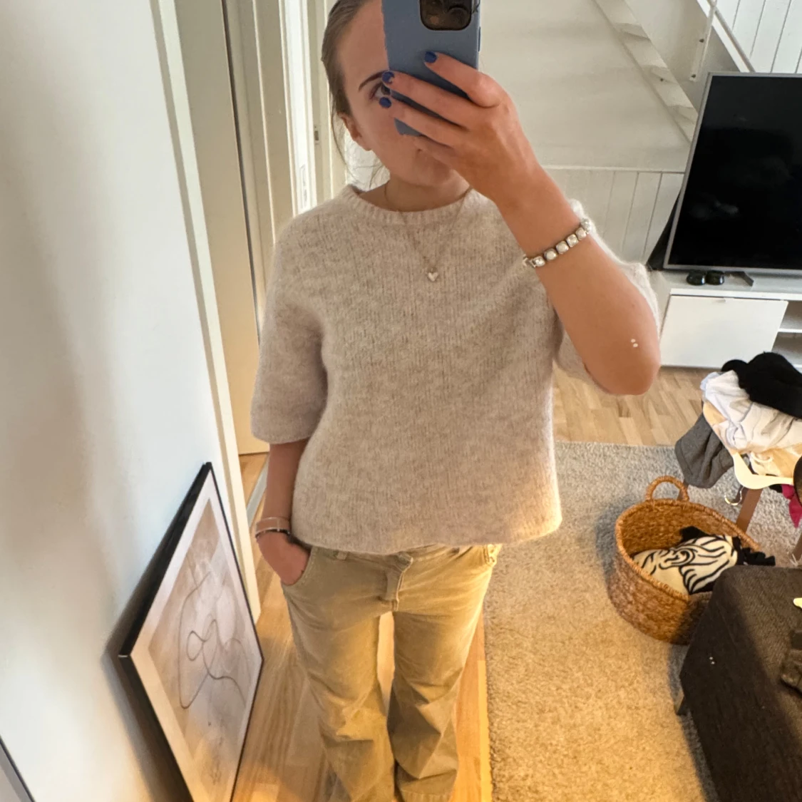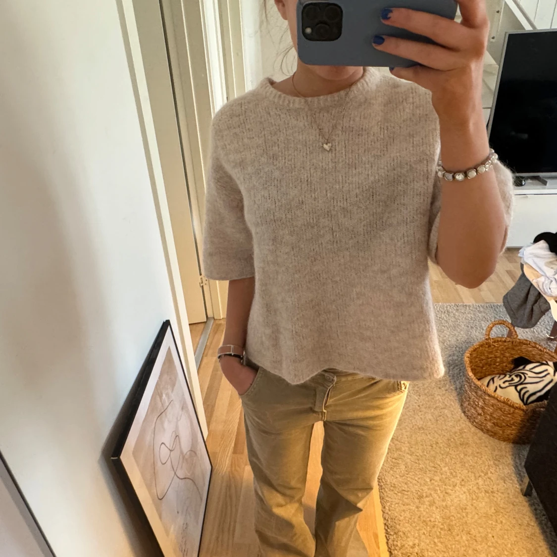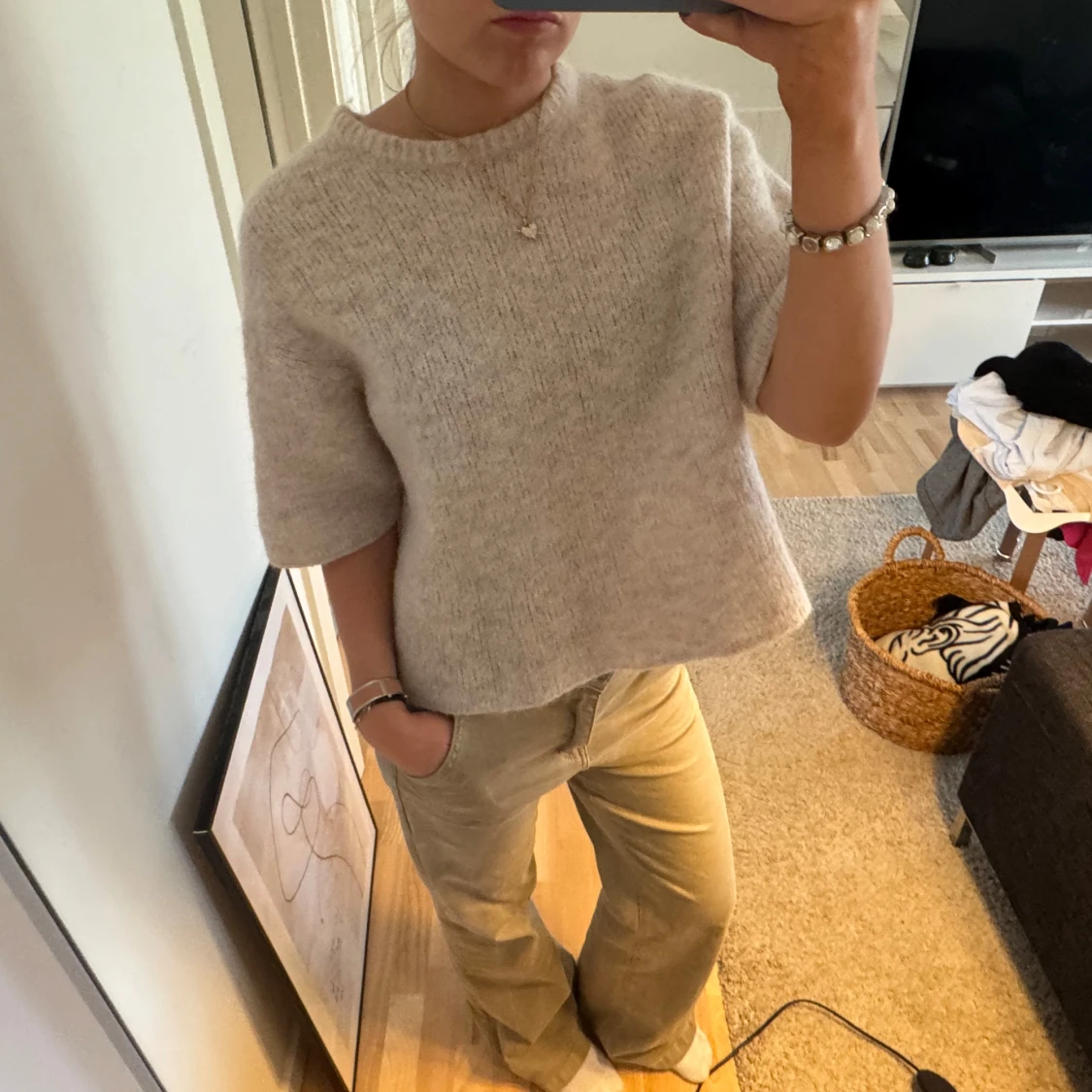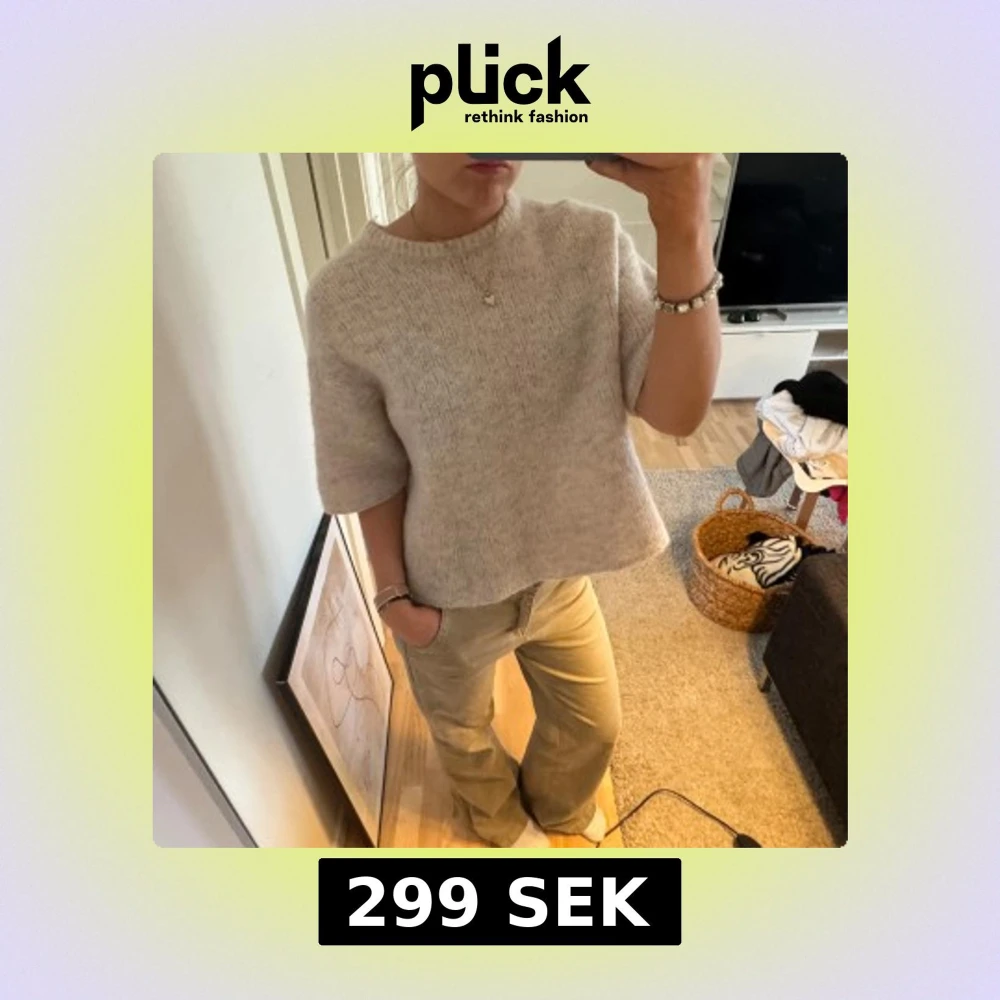 Säljer en stilren beige stickad tröja med korta ärmar. Perfekt för en avslappnad look. Tröjan har en rund hals och en bekväm passform.